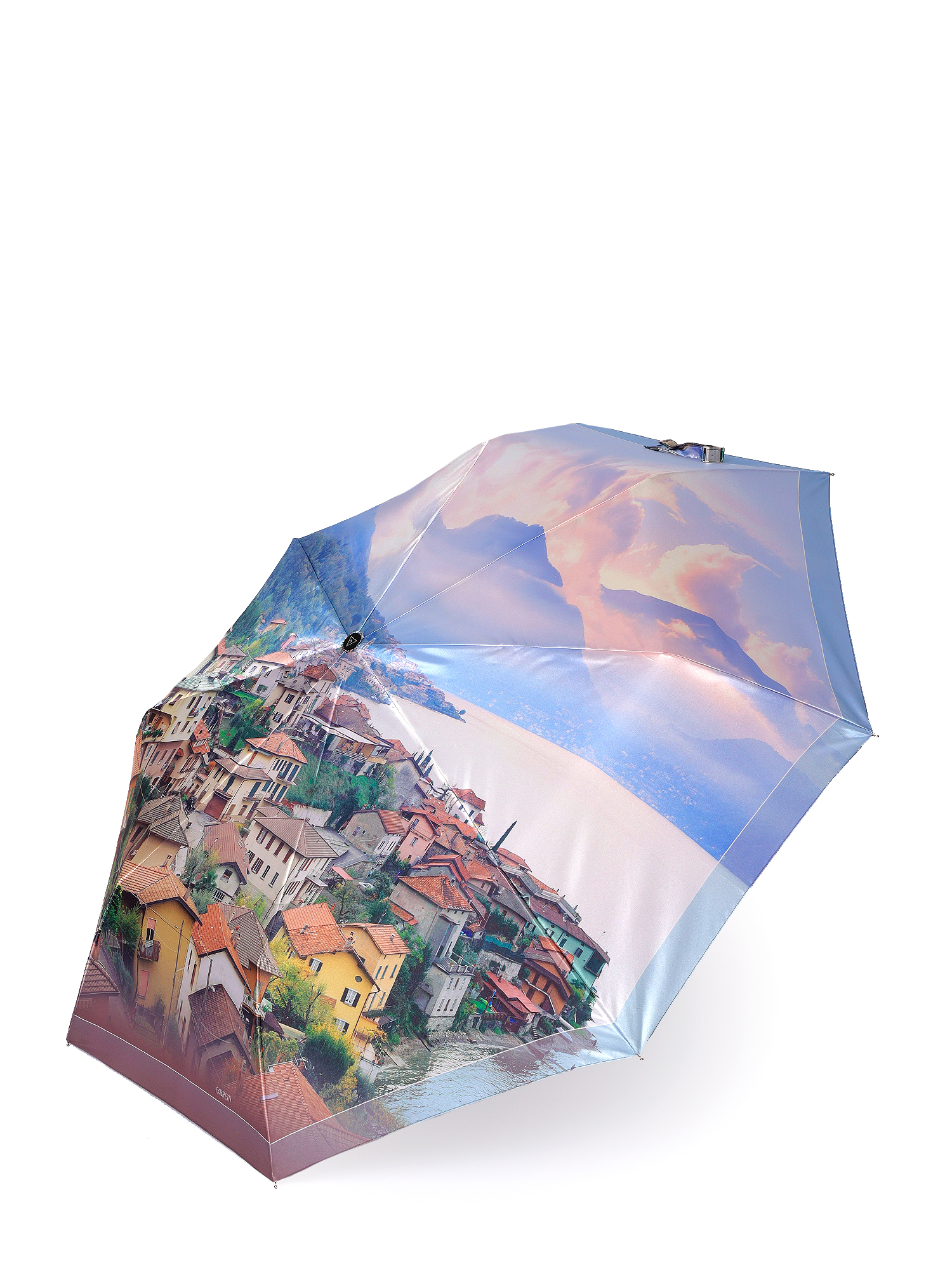 Зонт-автомат тройного сложения итальянского бренда FABRETTI в светло-голубом оттенке украшен детализированным принтом в виде городского пейзажа на фоне гор и облаков. Купол выполнен из гладкого искусственного сатина с шелковистой фактурой и мягким блеском.