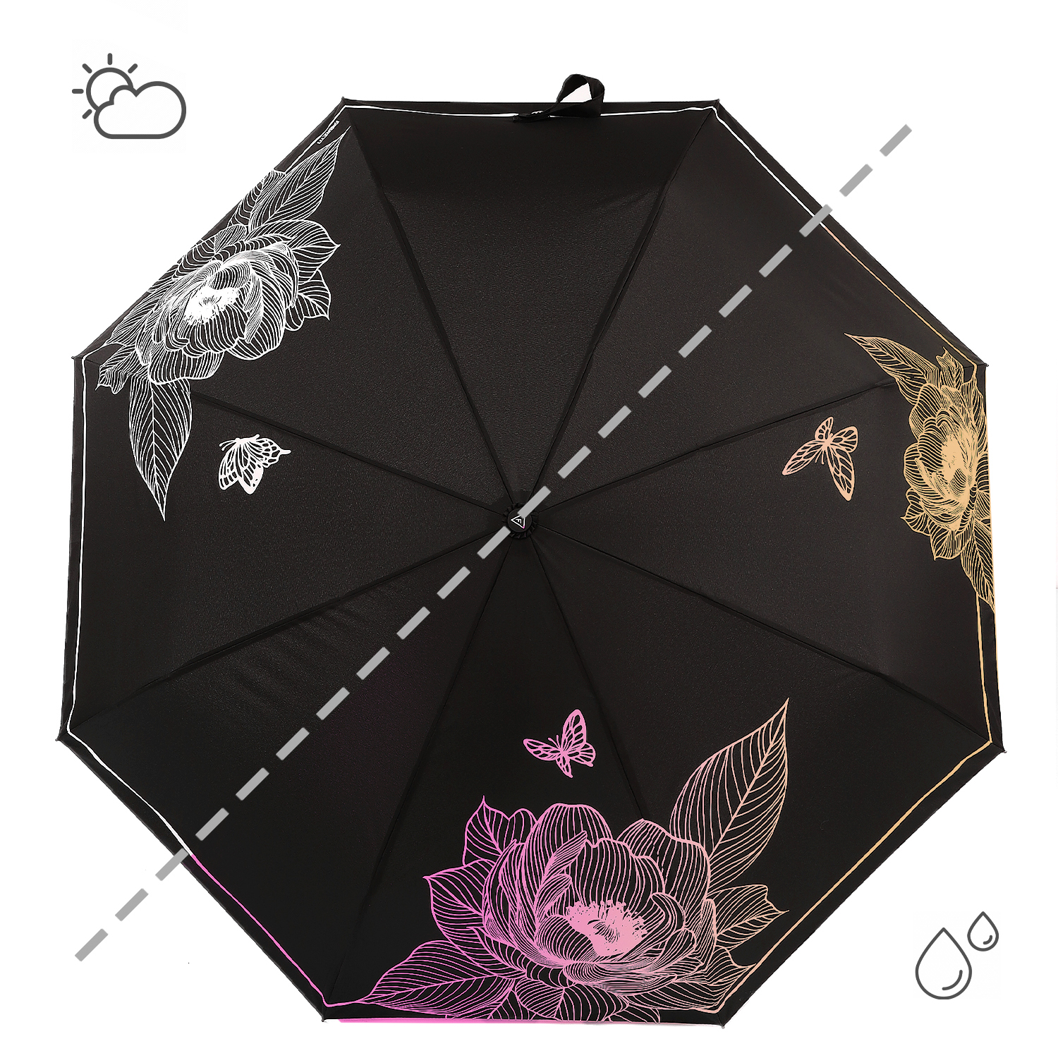Эксклюзивный женский зонт-автомат FABRETTI с эффектом «хамелеон» не только защитит от дождя, но и поднимет настроение в непогоду. Белый рисунок на однотонном черном фоне при намокании меняет цвет – роскошные розы становятся желтыми, оранжевыми и розовыми, а при высыхании - снова белыми.