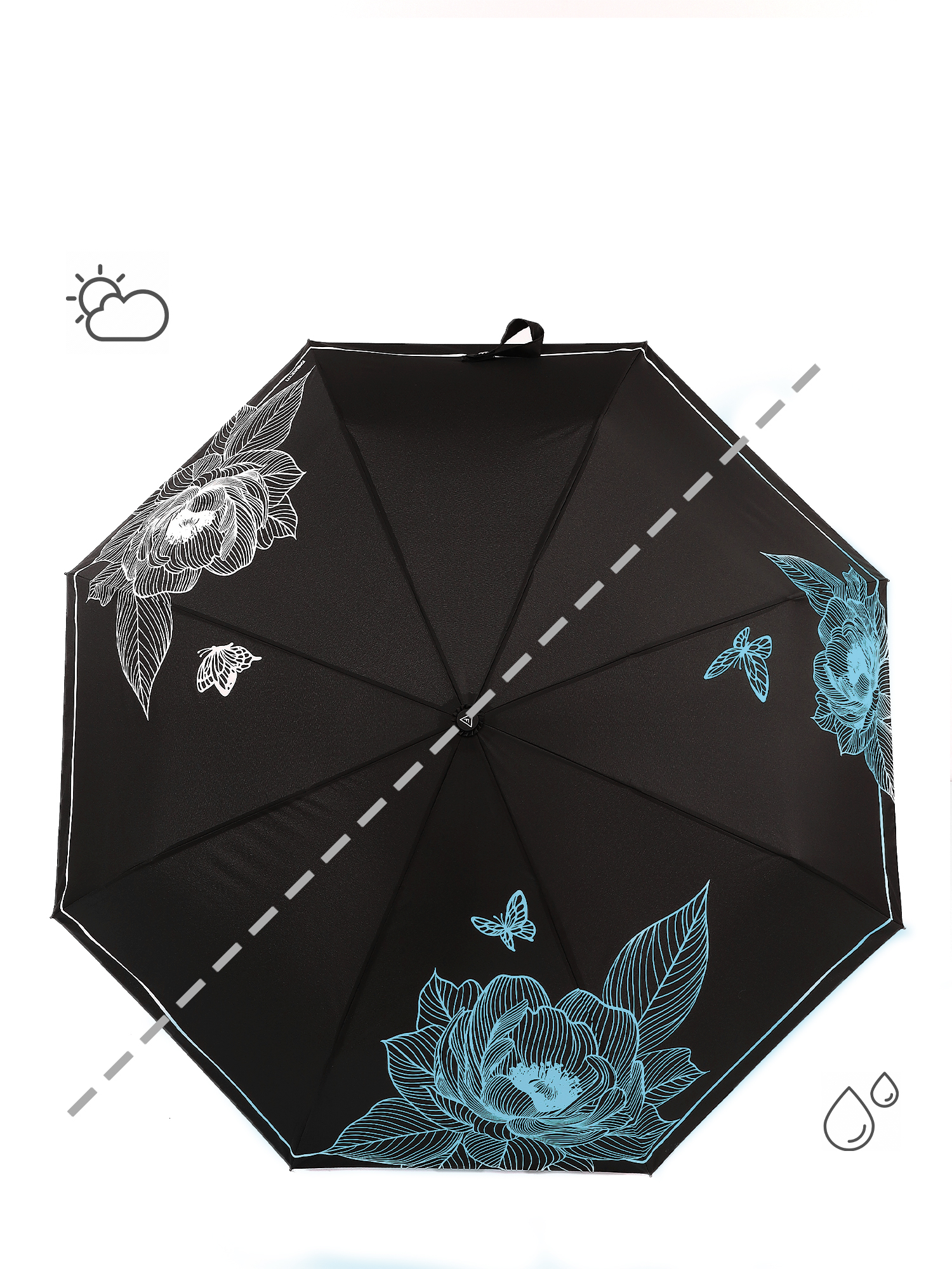 Эксклюзивный женский зонт-автомат FABRETTI с эффектом «хамелеон» не только защитит от дождя, но и поднимет настроение в непогоду. Белый рисунок на однотонном черном фоне при намокании меняет цвет – роскошные розы становятся ярко-бирюзовыми, а при высыхании - снова белыми.