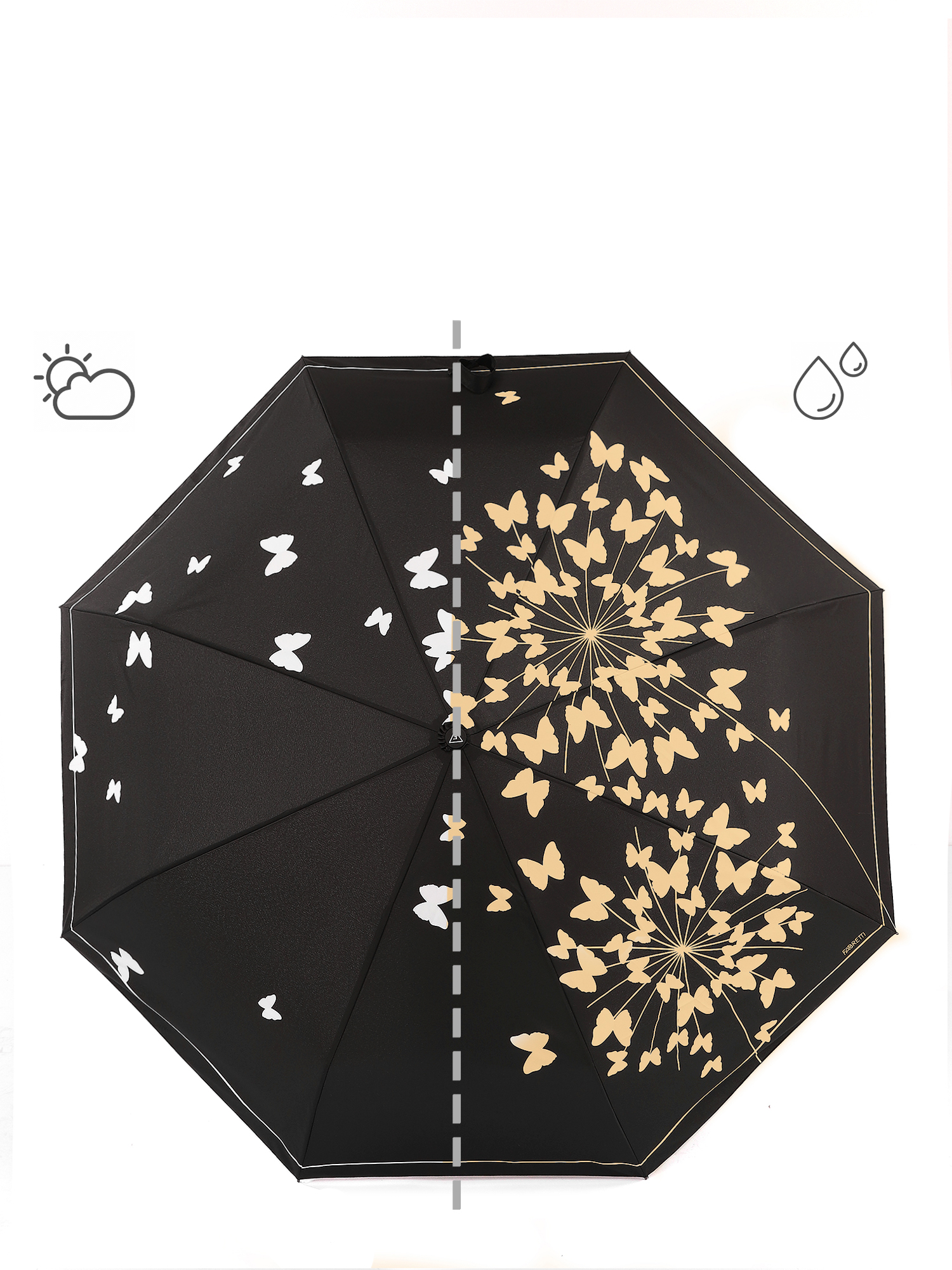 Эксклюзивный женский зонт-автомат FABRETTI с эффектом «хамелеон» не только защитит от дождя, но и поднимет настроение в непогоду. Белый рисунок на однотонном черном фоне при намокании меняет цвет – бабочки становятся ярко-желтыми, а при высыхании - снова белыми.