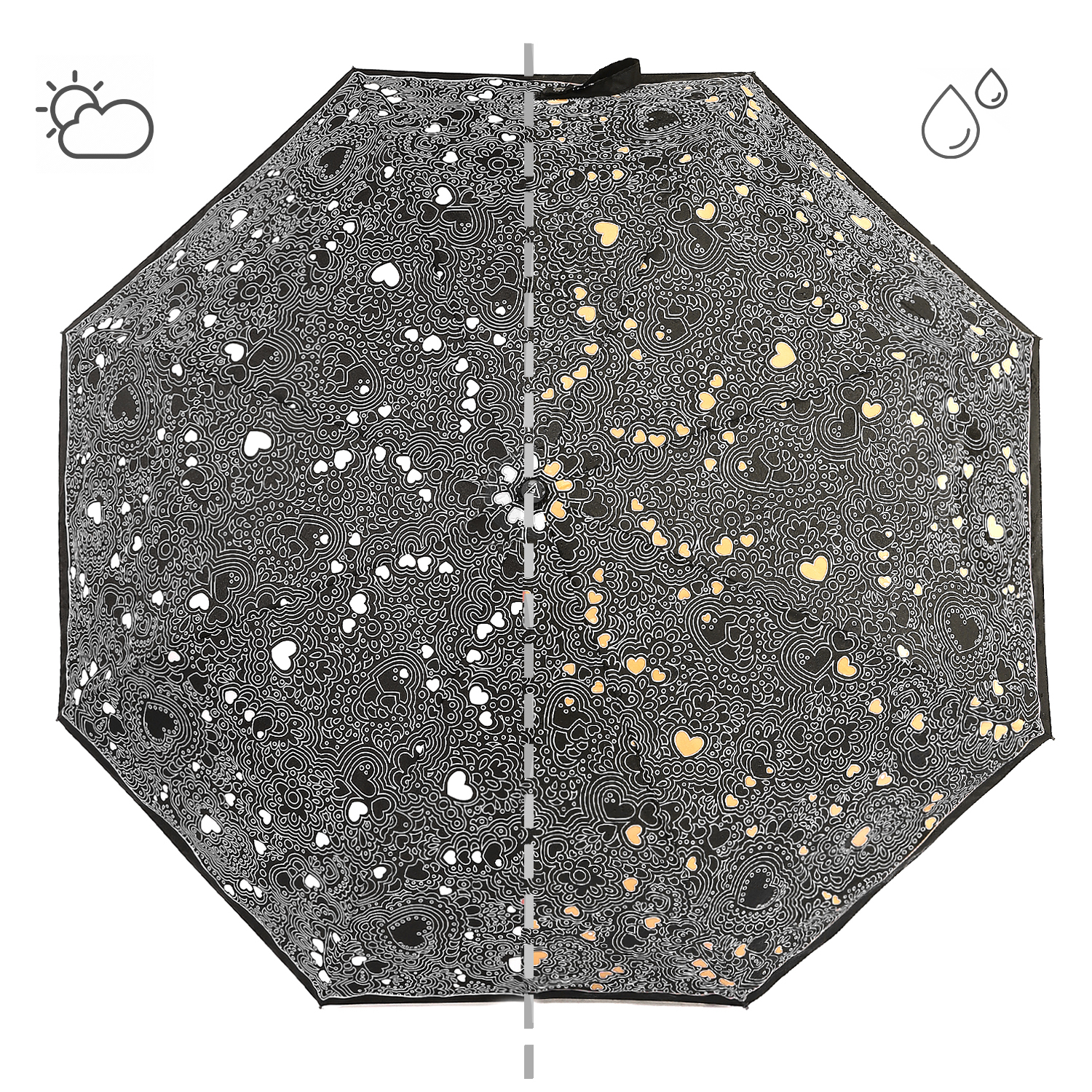 Эксклюзивный женский зонт-автомат FABRETTI с эффектом «хамелеон» не только защитит от дождя, но и поднимет настроение в непогоду. Белый рисунок на однотонном черном фоне при намокании меняет цвет – сердца становятся ярко-желтыми, а при высыхании - снова белыми.
