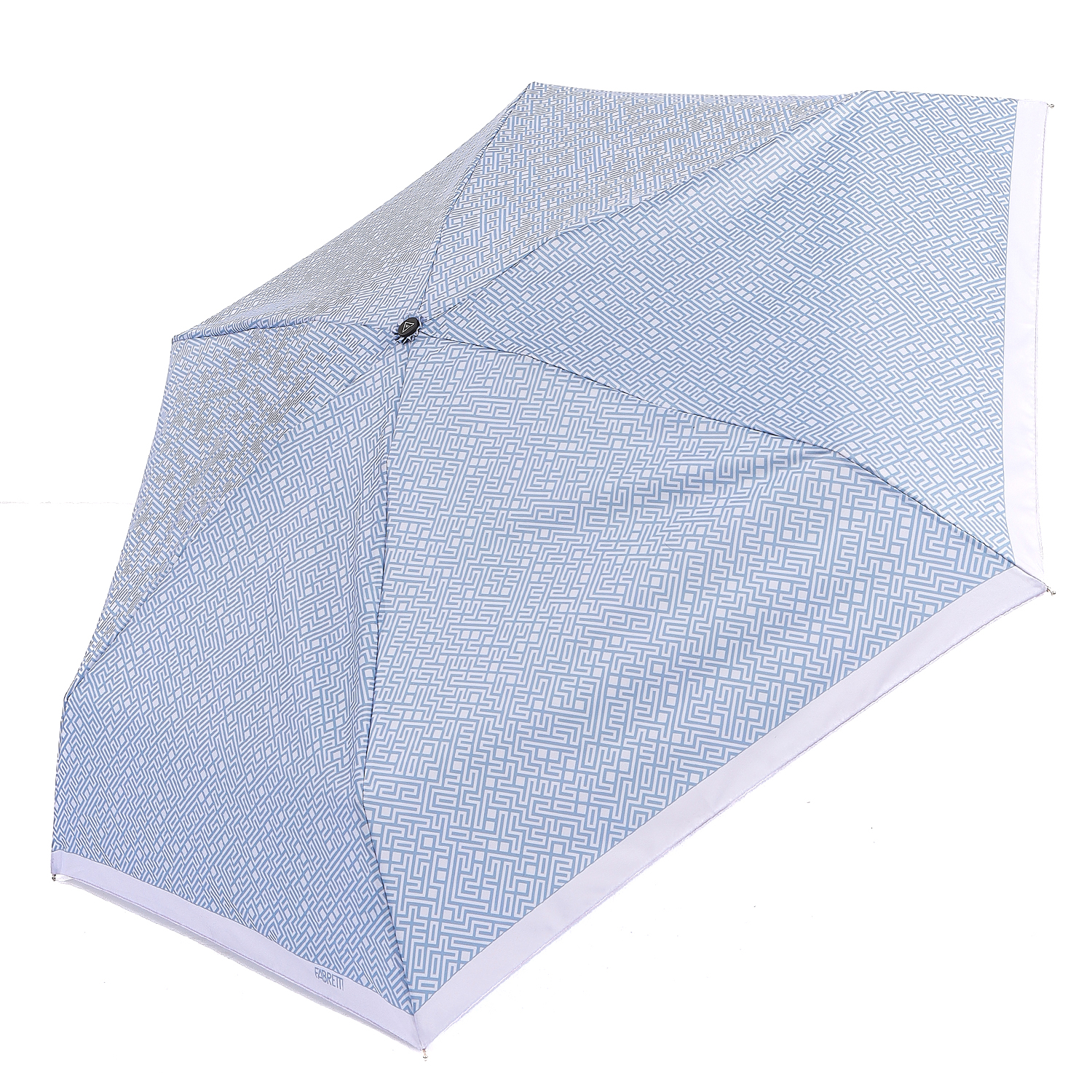Компактный механический зонт-мини итальянского бренда FABRETTI в 5 сложениях легко поместится в женскую сумку и всегда будет под рукой в нужный момент. Купол в светло-голубом оттенке украшен сложным геометрическим узором-лабиринтом; выполнен из материала с матовой фактурой эпонж. Она придает ткани высокую прочность и устойчивость к выцветанию.