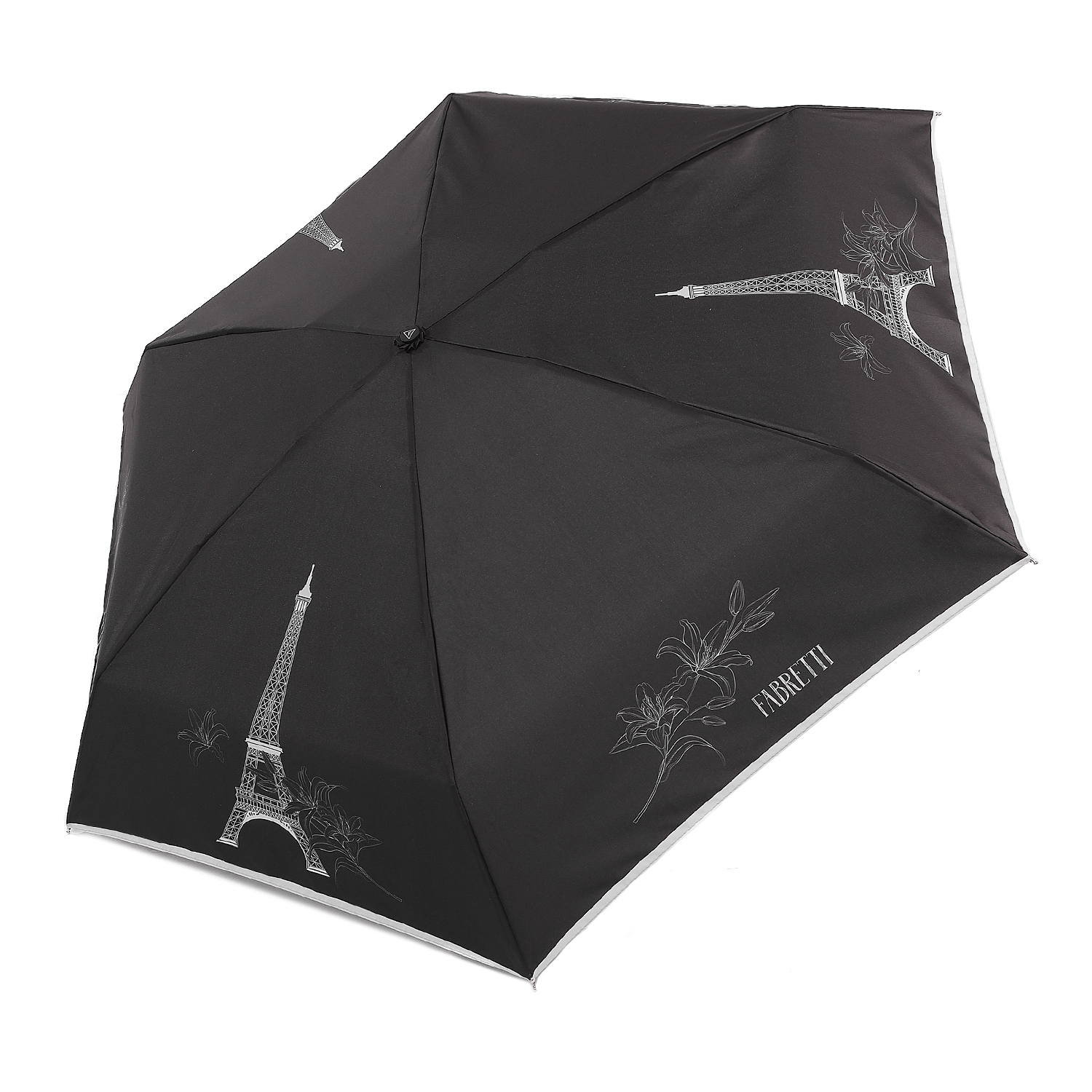 Компактный механический зонт-мини итальянского бренда FABRETTI в 5 сложениях легко поместится в женскую сумку и всегда будет под рукой в нужный момент. Купол в классическом черном цвете украшен монохромным принтом в виде Эйфелевой башни и цветов лилии; выполнен из материала с матовой фактурой эпонж. Она придает ткани высокую прочность и устойчивость к выцветанию.