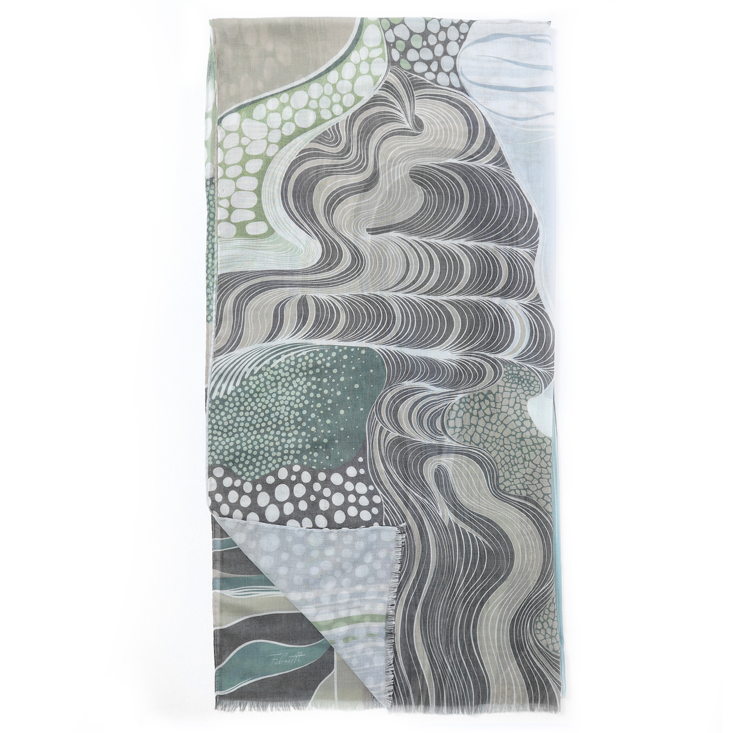 Легкий женский шарф итальянского бренда FABRETTI с невероятным узором из волн, линий, гороха и камней в природных зеленых и бежевых тонах идеально подходит для теплого сезона.