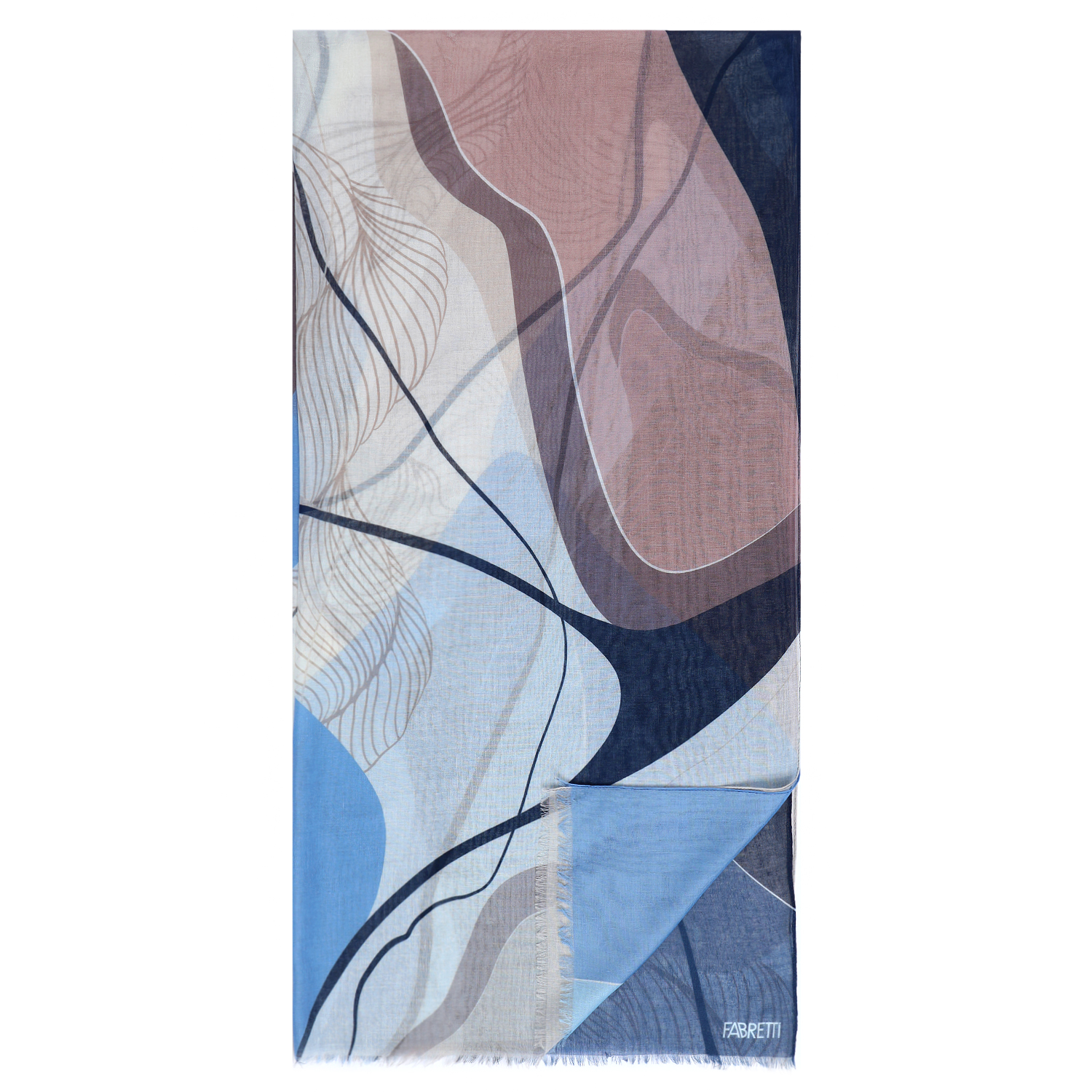 Легкий женский шарф итальянского бренда FABRETTI со сложным абстрактным узором, разводами, линиями и полосками в оттенках голубого и бежевого.