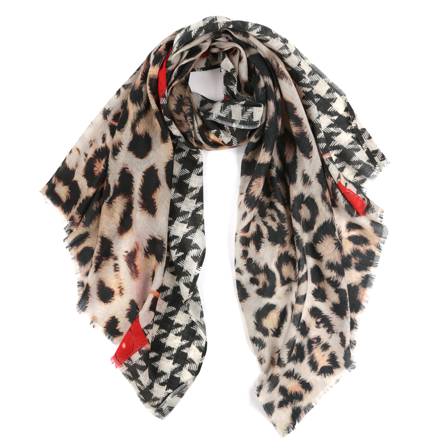 Женский шарф LEO VENTONI в бежевой гамме выполнен из тонкой, почти невесомой шерсти с небольшим дополнением шелка. Материал с таким составом хорошо пропускает воздух, удерживает тепло, красиво драпируется. В качестве декора выбран анималистический принт и гусиная лапка. Аккуратные реснички на концах придают модели законченный вид.