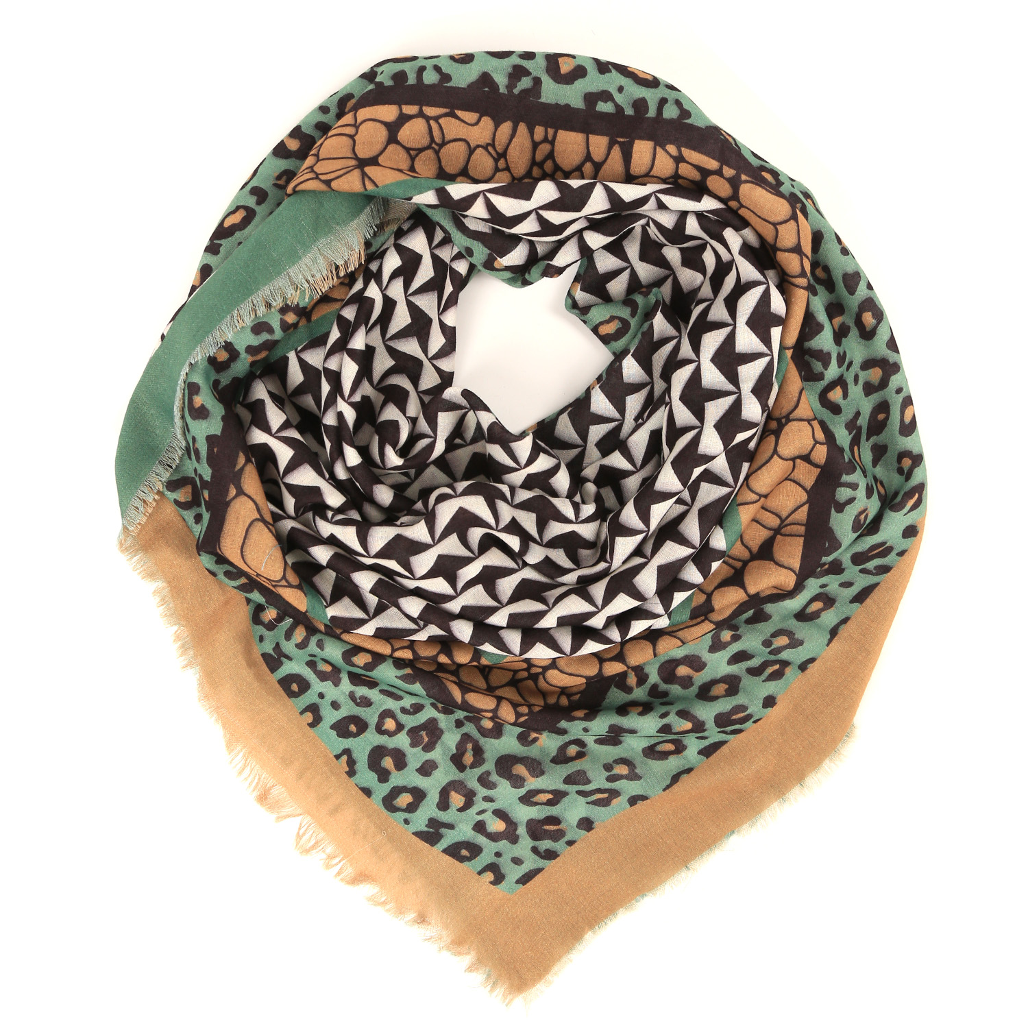 Стильный платок FABRETTI в зеленом оттенке обладает приятной текстурой и дополнит любой образ. Абстрактный орнамент и анималистический принт придают изделию особую выразительность. Аксессуар выполнен из качественного полиэстера, обладающего мягкостью, лёгкостью, устойчивостью к сохранению цвета и формы. Края изделия украшены мелкими ресничками.