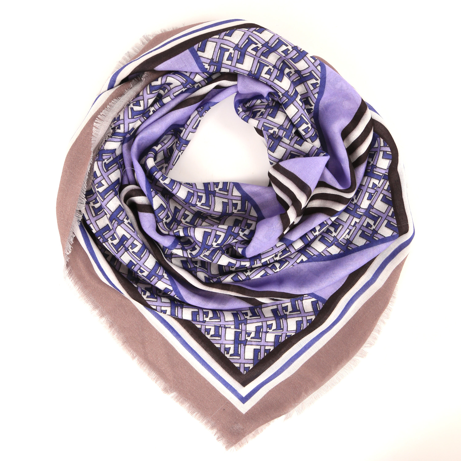 Стильный платок FABRETTI в сиренево-бежевой гамме обладает приятной текстурой и дополнит любой образ. Эффектный орнамент в стиле «Логомания» в сочетании с контрастной полоской придает изделию особую выразительность. Аксессуар выполнен из качественного полиэстера, обладающего мягкостью, лёгкостью, устойчивостью к сохранению цвета и формы. Края изделия украшены мелкими ресничками.