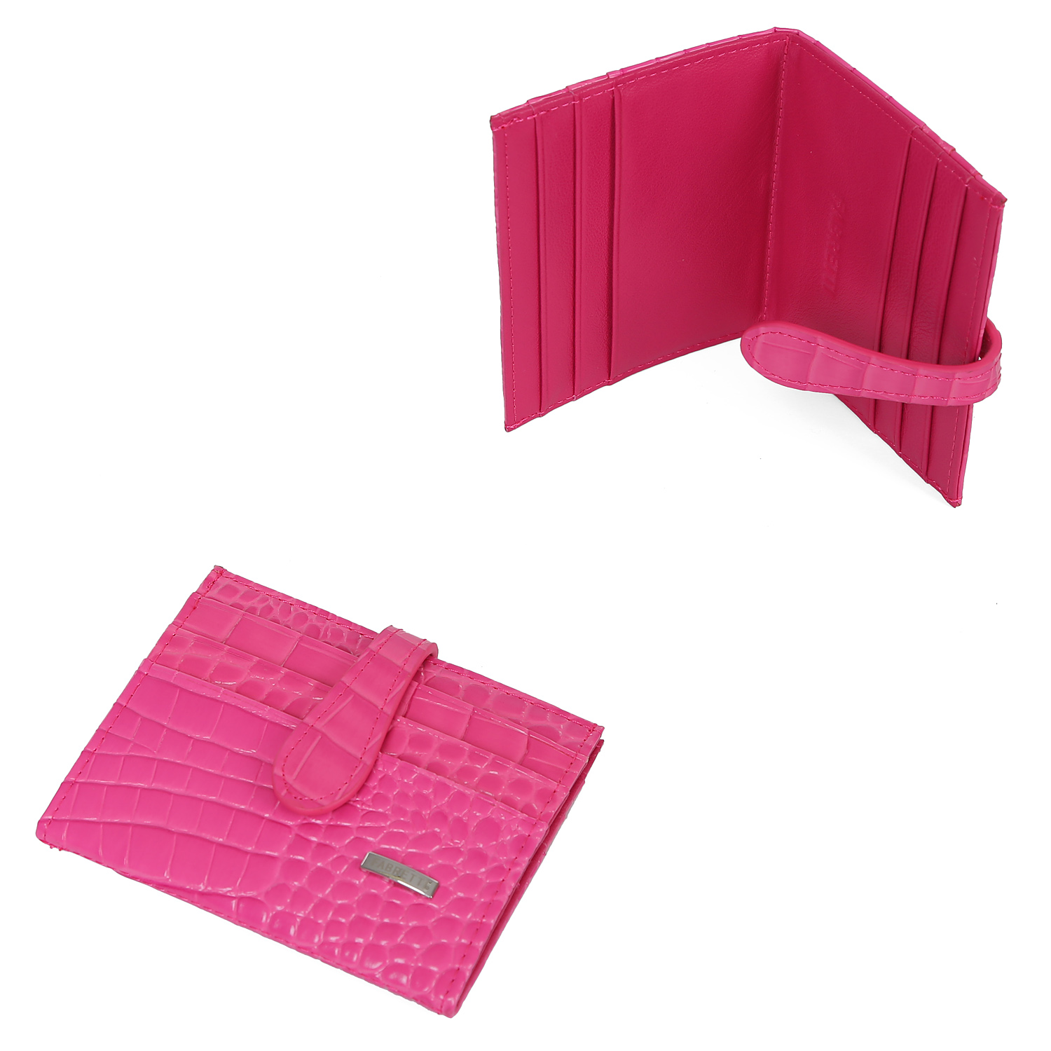Компактная женская визитница от итальянского бренда Fabretti в эффектном розовом цвете выполнена из лаковой кожи с тиснением под рептилию. Аксессуар закрывается на кнопку, внутри расположены 14 карманов для дисконтных и банковских карт. Фурнитура под серебро.