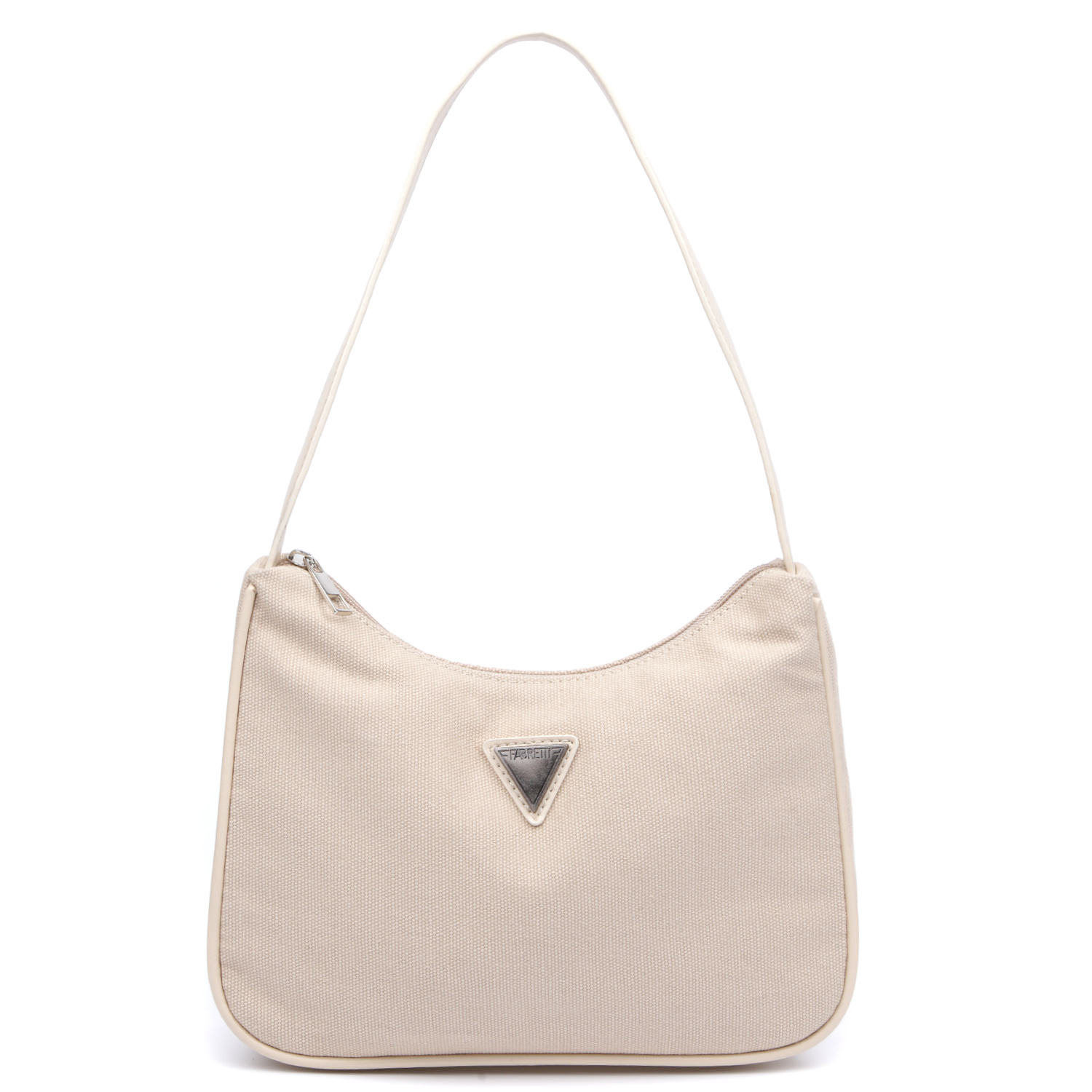 Стильная сумка-багет FABRETTI в светло-бежевом оттенке выполнена из хлопковой канвы плотной текстуры. Основное отделение закрывается на молнию. Внутри есть 2 открытых боковых кармана для мелочей. Лицевая сторона декорирована треугольным шильдом с логотипом компании. Плечевой ремень шириной 3 см, позволяет комфортно носить аксессуар на плече или в руке.
