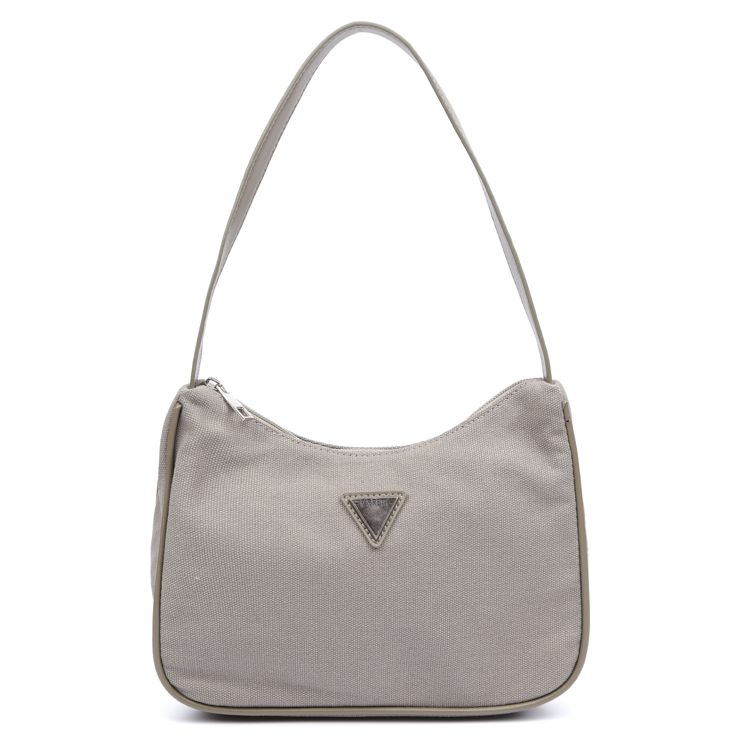 Стильная сумка-багет FABRETTI в сером оттенке выполнена из хлопковой канвы плотной текстуры. Основное отделение закрывается на молнию. Внутри есть 2 открытых боковых кармана для мелочей. Лицевая сторона декорирована треугольным шильдом с логотипом компании. Плечевой ремень шириной 3 см, позволяет комфортно носить аксессуар на плече или в руке.
