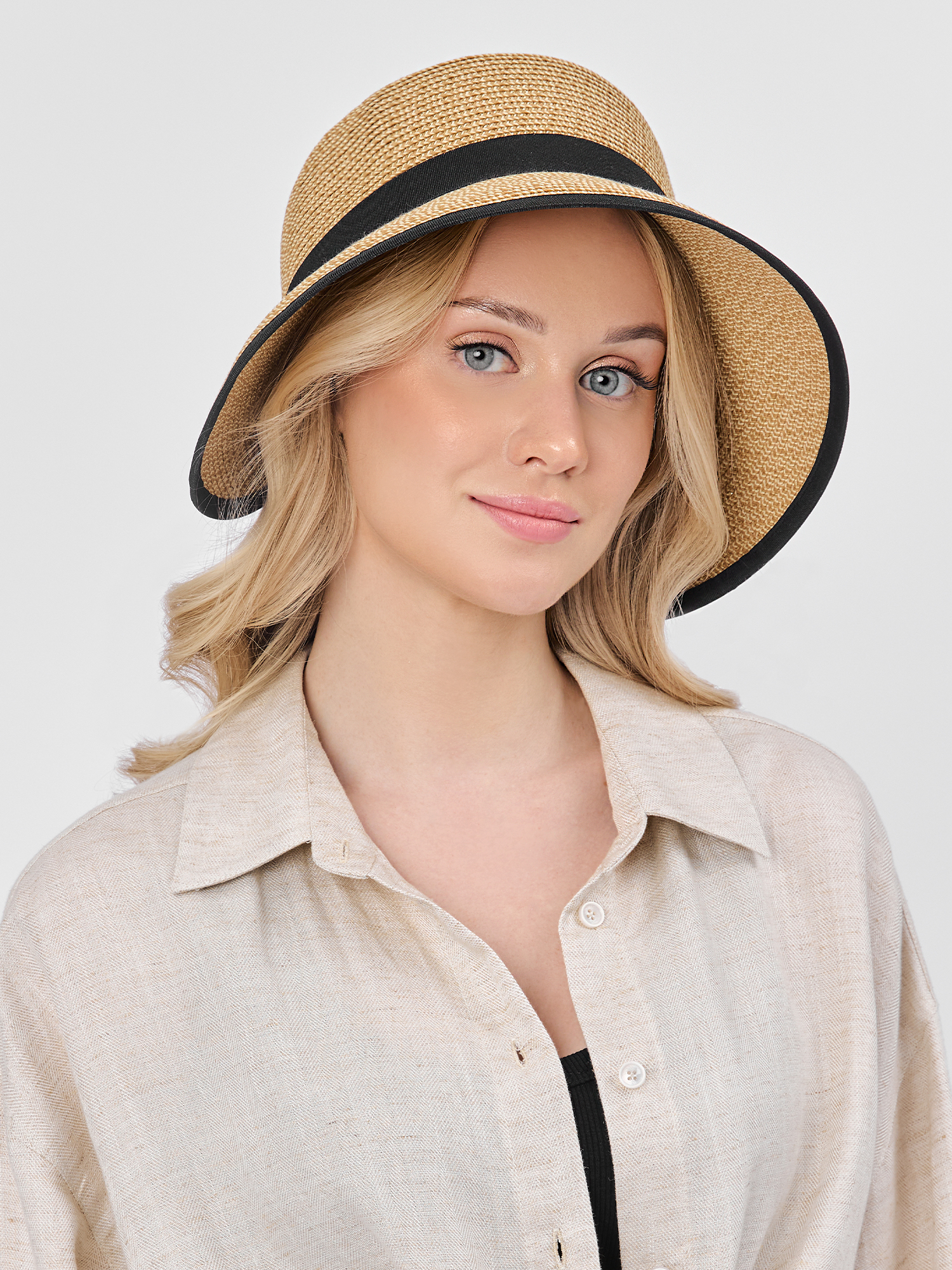 Необычная летняя шляпа-козырек итальянского бренда FABRETTI сочетает две классических модели шляп: абажур с широкими опущенными полями и кепи с застежкой-липучкой в затылочной части.  Эта модель в бежевом цвете с черной отделкой смотрится более динамично и современно, она подойдет даже к образу в полуспортивном стиле. Тулья украшена текстильной лентой, края полей оформлены тем же материалом. Верх тульи плоский.