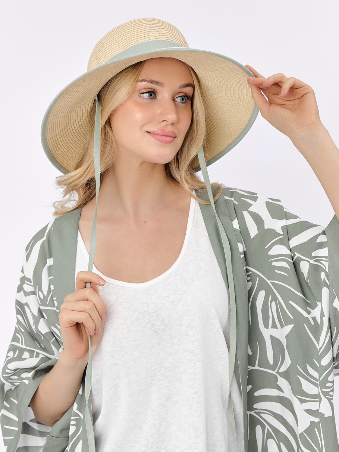 Легкая широкополая женская шляпа из коллекции итальянского бренда FABRETTI в классическом песочном цвете с зеленым декором. Шляпа-абажур с опущенными полями – самая летняя модель, надежно защищающая лицо и шею от солнца и придающая образу романтичную загадочность. Она украшена широкой текстильной лентой на тулье, поля окантованы в тон, внутри также есть две длинных ленты-завязки.