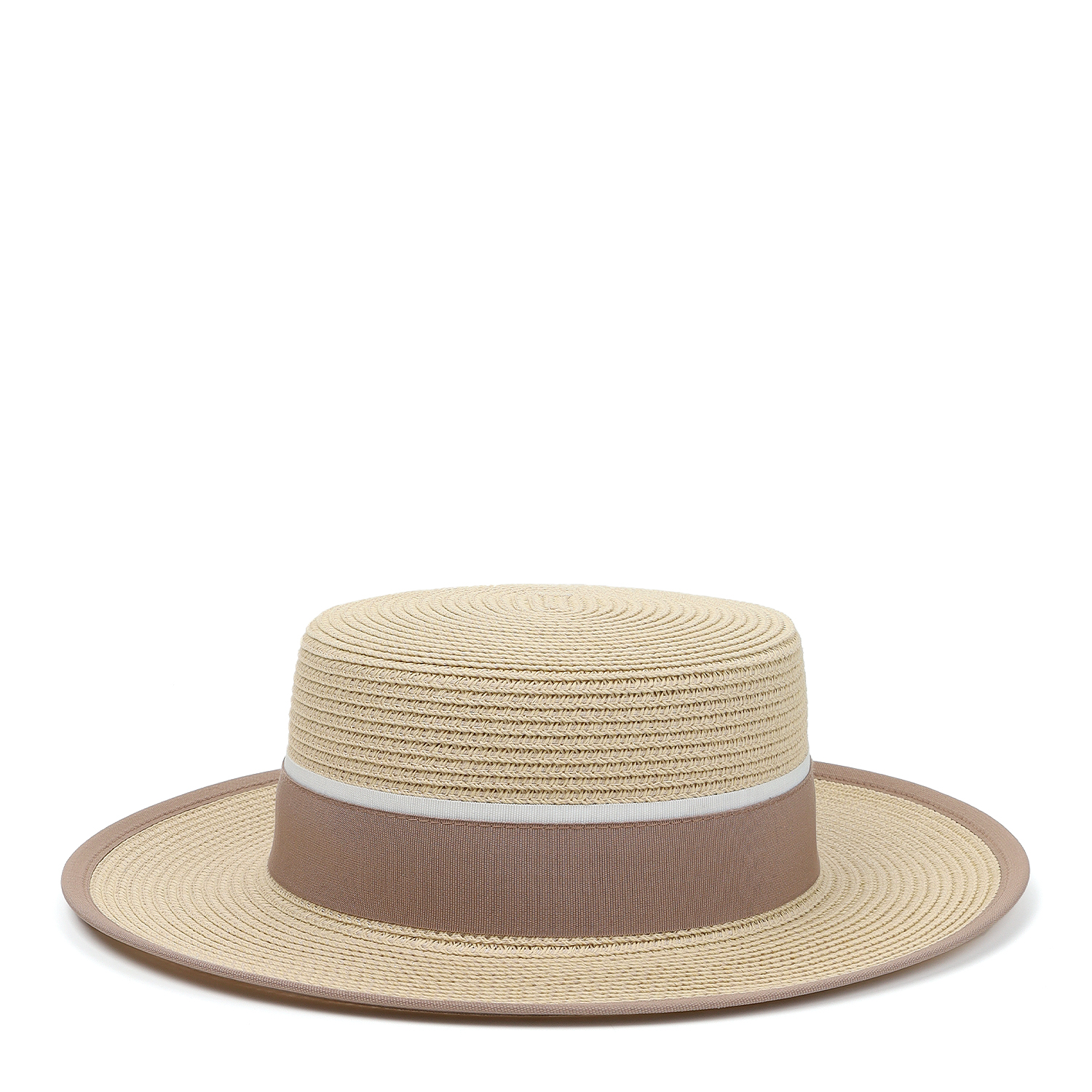Элегантная летняя женская шляпа-канотье итальянского бренда FABRETTI в классическом соломенном оттенке. Эта шляпка с плоской тульей и узкими, прямыми полями украшена широкой текстильной лентой темно-бежевого цвета на тулье и кантом из того же материала по краю полей. Внутри размер регулируется лентой.
