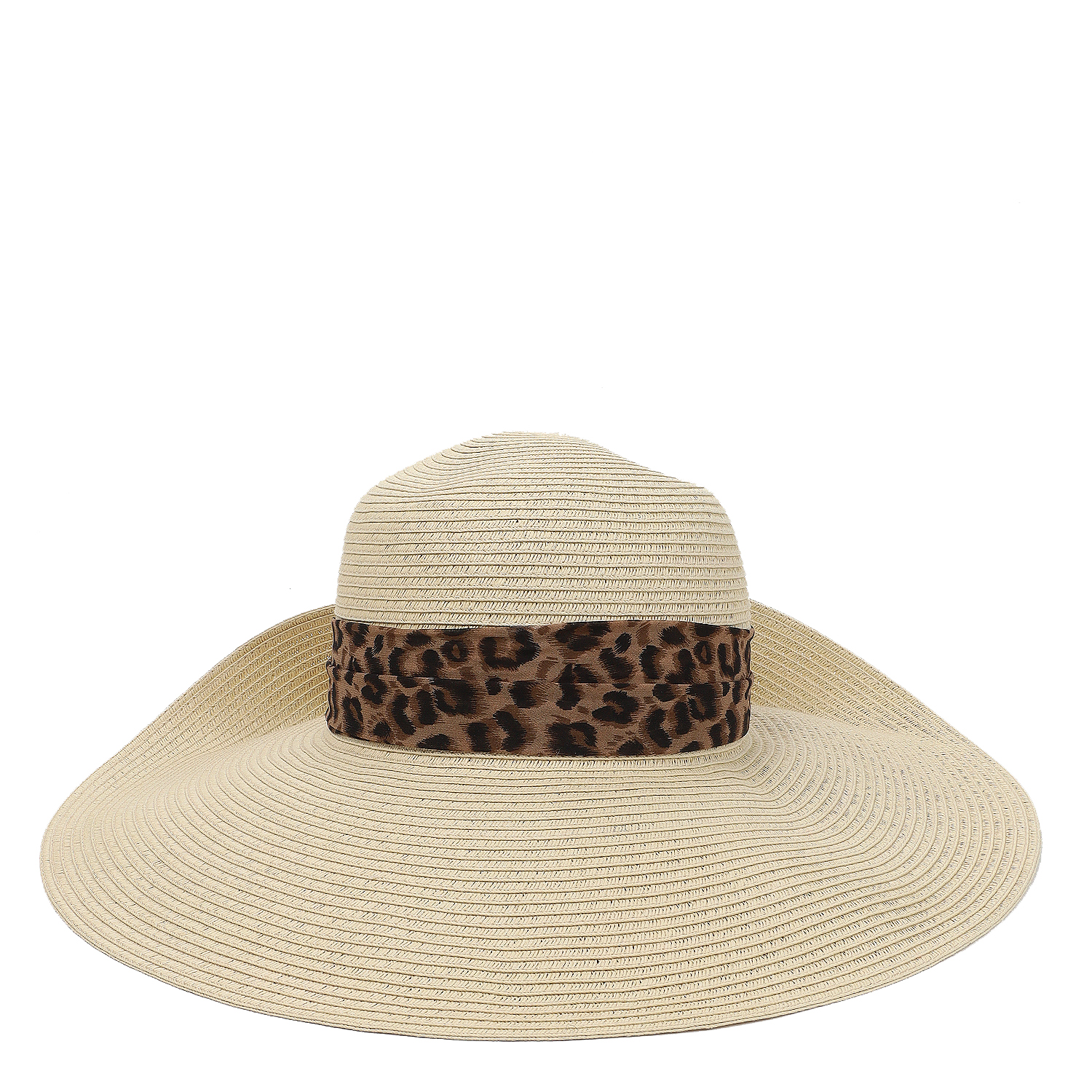 Шляпа оригинально украшена широкой и длинной шифоновой лентой с леопардовым принтом на тулье, пропущенной через люверсы на полях и повязанной пышным бантом.