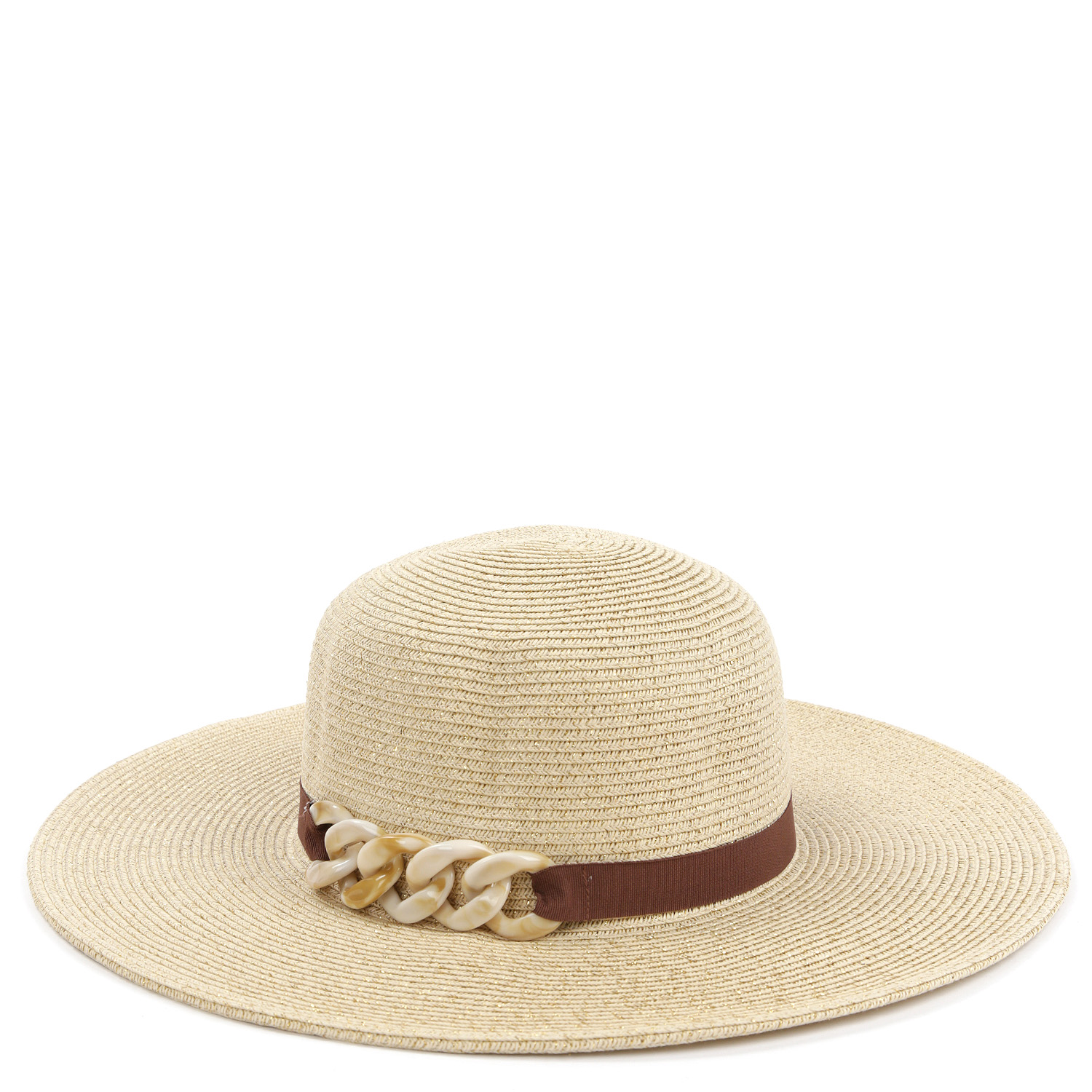 Стильная шляпа флоппи FABRETTI с широкими мягкими полями выполнена из целлюлозы - современного материала натурального происхождения, отличающегося разнообразием структур. Бежевый оттенок позволяет аксессуару сделать пляжный и городской летний образы более выразительными. Тулья шляпы украшена коричневой текстильной лентой с крупной цепью. Размер шляпы регулируется с помощью внутренней утягивающей ленты.