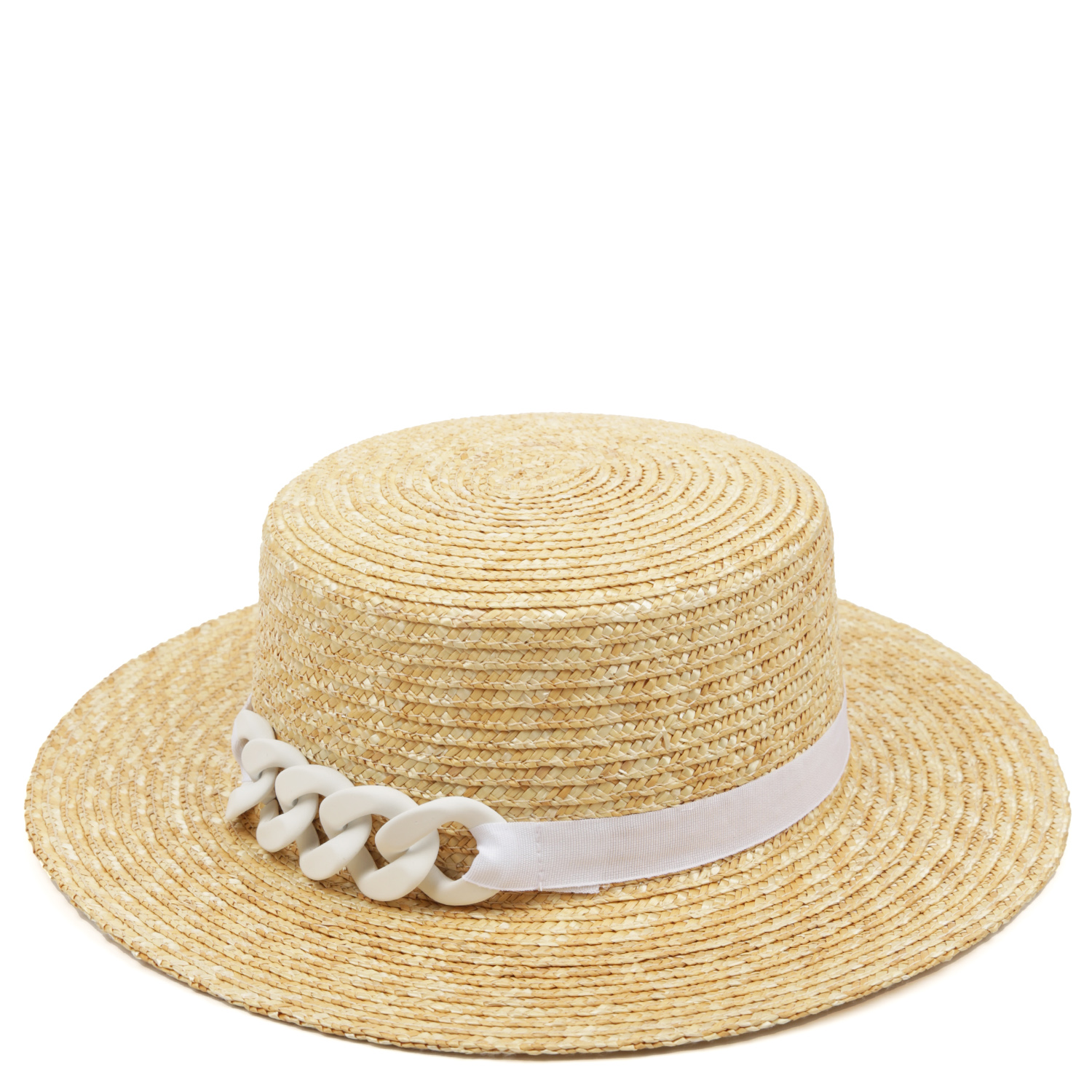 Стильная шляпа канотье FABRETTI в бежевом оттенке выполнена из собранной вручную и хорошо просушенной натуральной соломки - экологичного материала премиального качества. В такой шляпе будет комфортно даже в самый знойный полдень. Тулья украшена белой текстильной лентой с крупной матовой цепью в тон. Ровные поля выгодно подчеркивают черты лица. Размер шляпы регулируется с помощью внутренней утягивающей ленты.