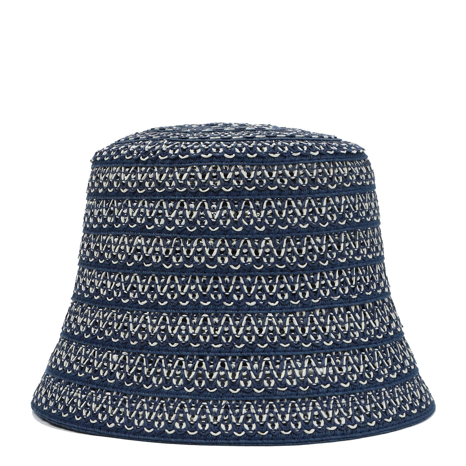 Шляпа выполнена в сочетании синего и белого цветов. Внутри объем регулируется лентой.