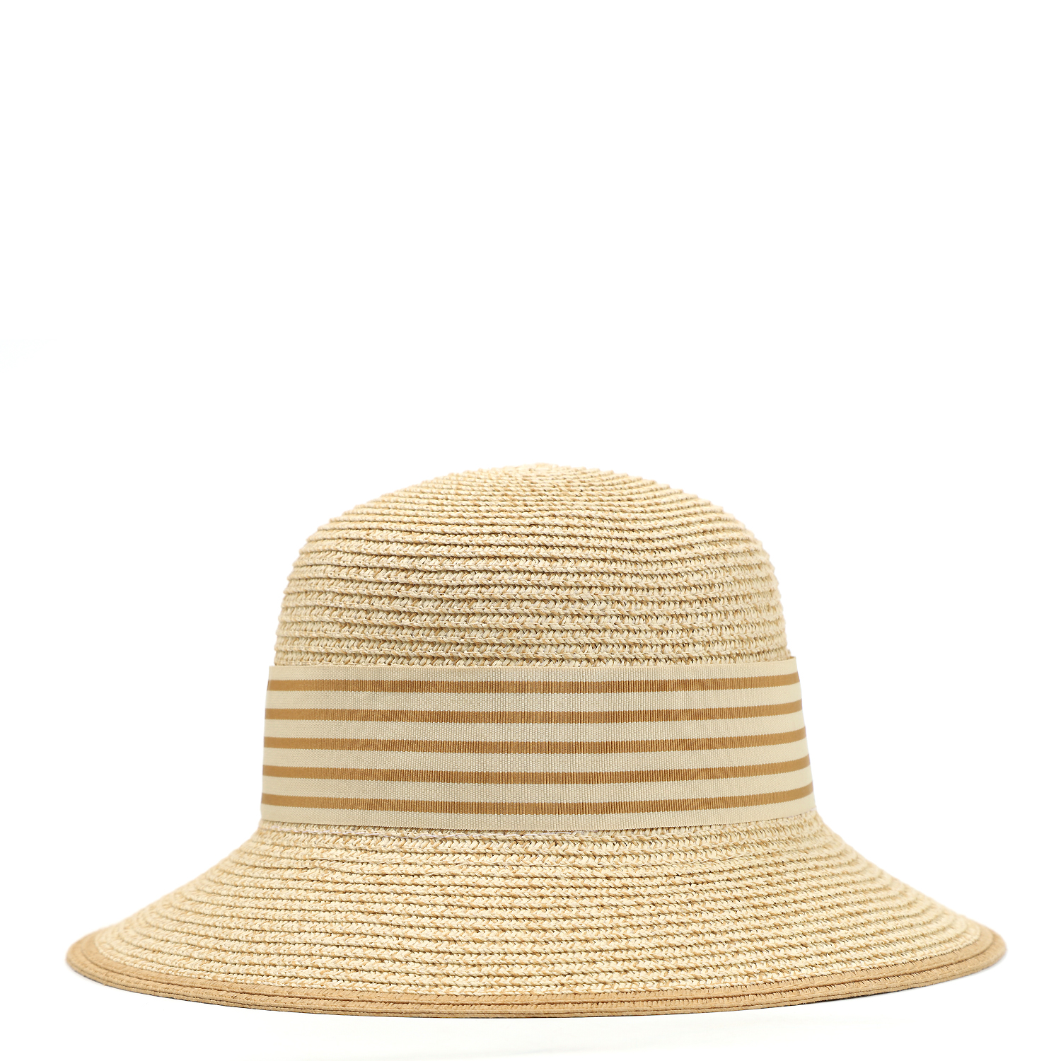 Шляпа украшена широкой текстильной лентой в полоску на тулье, края полей окрашены в тон. Внутри размер регулируется лентой.