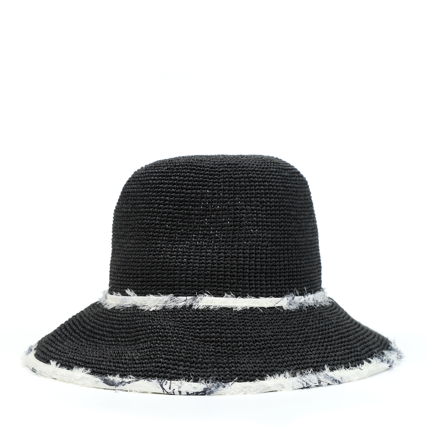Легкая женская шляпа итальянского бренда FABRETTI с необычной контрастной отделкой в черном цвете. Эта шляпа-абажур с опущенными полями выполнена из плетеного волокна целлюлозы. Поля дополнены текстильной подкладкой с узором в виде бабочек и «ресничками» - пушистым ворсом на узорах. Тулья украшена тонкой лентой из аналогичной ткани с бантом. Внутри размер шляпы регулируется лентой.