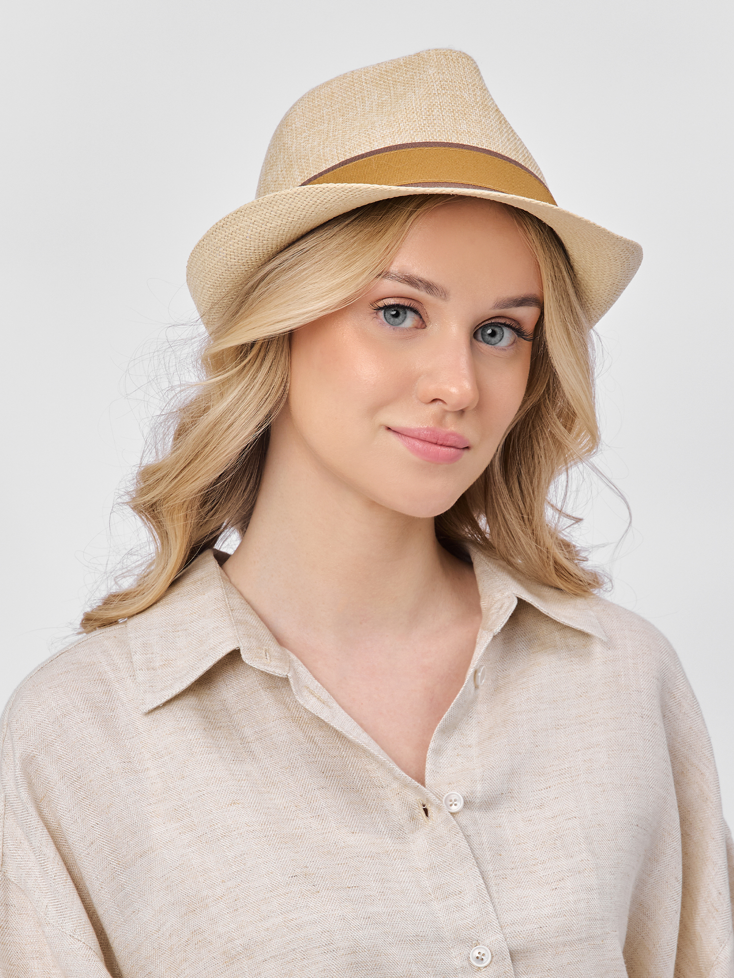 Шляпа Федора с короткими, загнутыми сзади полями и жесткой формованной тульей с характерным заломом сочетает в своем декоре два типа соломки и декор в виде двухцветной текстильной ленты. Внутри размер регулируется лентой.