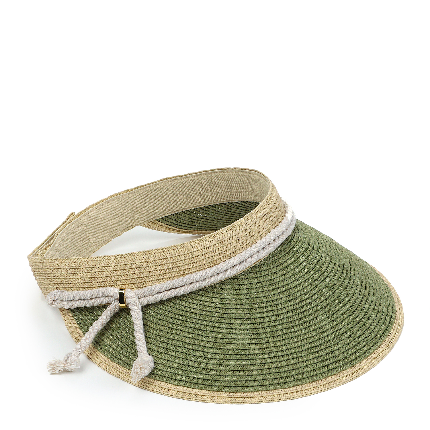 Широкий летний козырек итальянского бренда FABRETTI бежевого и зеленого цветов. Этот ретро-аксессуар с широким козырьком прекрасно защищает от солнца и добавляет в образ спортивной динамики.
