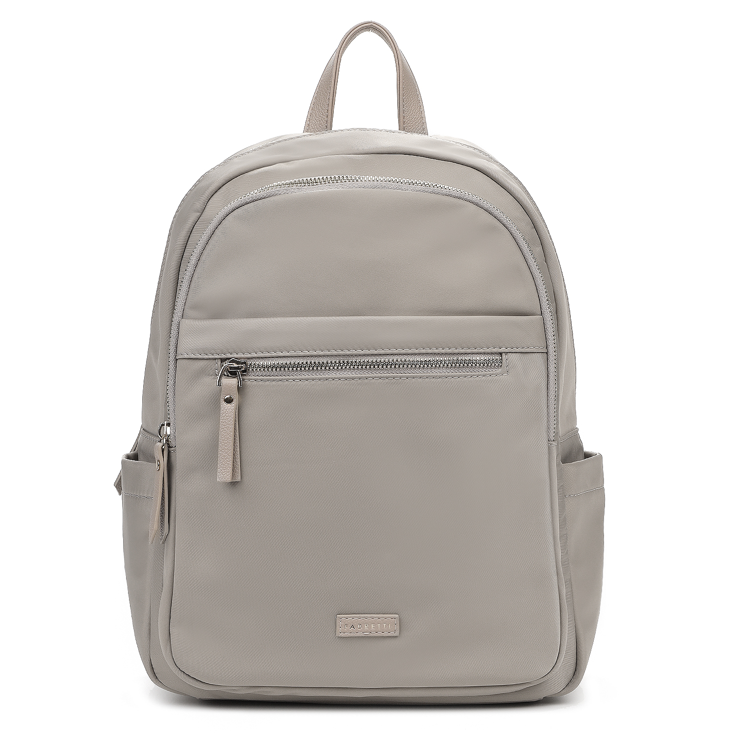 Современный женский городской рюкзак из коллекции итальянского бренда FABRETTI в нежном сером оттенке с бежевыми нотками.
