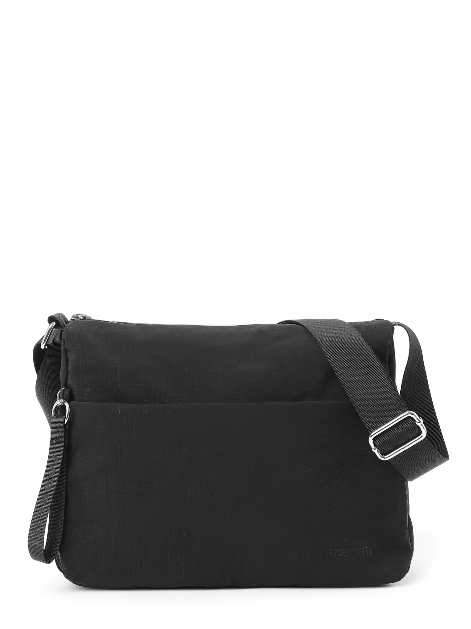 У сумки одно основное отделение на молнии, на лицевой и тыльной сторонах по большому карману быстрого доступа на молнии. Внутри отделения два открытых кармана и один на молнии, карабин для ключей на длинном текстильном ремешке.