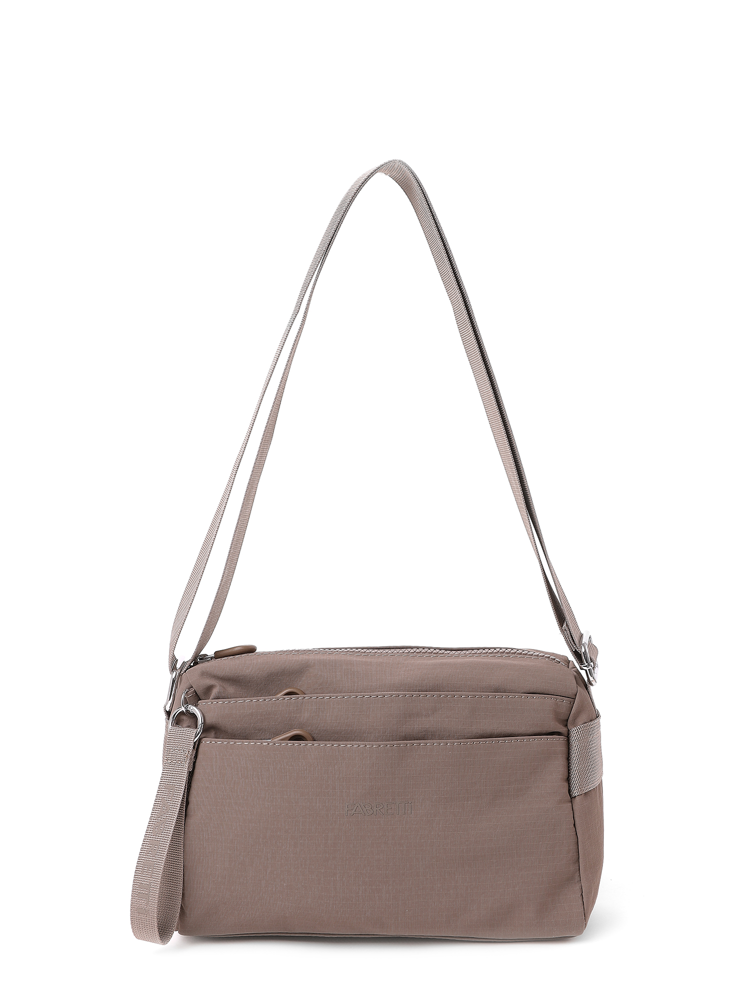 Небольшая вместительная текстильная женская сумка итальянского бренда FABRETTI отлично подходит для городского стиля и коротких поездок. Горизонтальная модель прямоугольной формы выполнена из легкой ткани с характерной фактурой в клетку в темно-бежевом цвете.