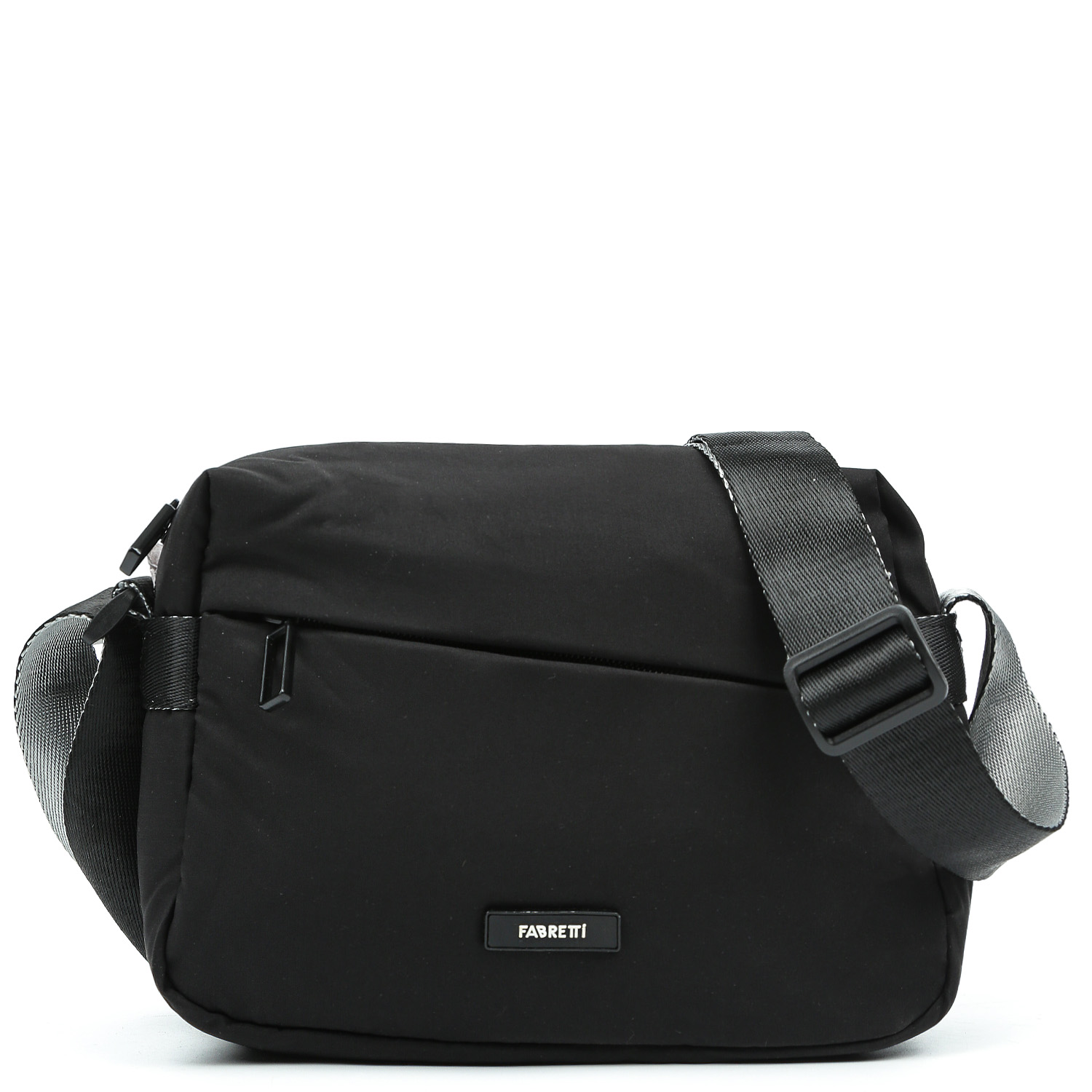 Компактная текстильная сумка через плечо FABRETTI в черном цвете выполнена из высокотехнологичного влагостойкого полиэстера. Он практичен и прост в уходе. Основное отделение закрывается на полукруглую молнию с металлическим поводком. Внутри есть 2 боковых кармана для мелочей: открытый и на молнии. На лицевой стороне расположен потайной карман на молнии. На тыльной стороне предусмотрен карман быстрого доступа на молнии. Плечевой ремень регулируется по длине, ширина - 3 см. Сумка станет незаменимым аксессуаром в любой поездке, а также гармонично впишется в спортивный и casual стиль.