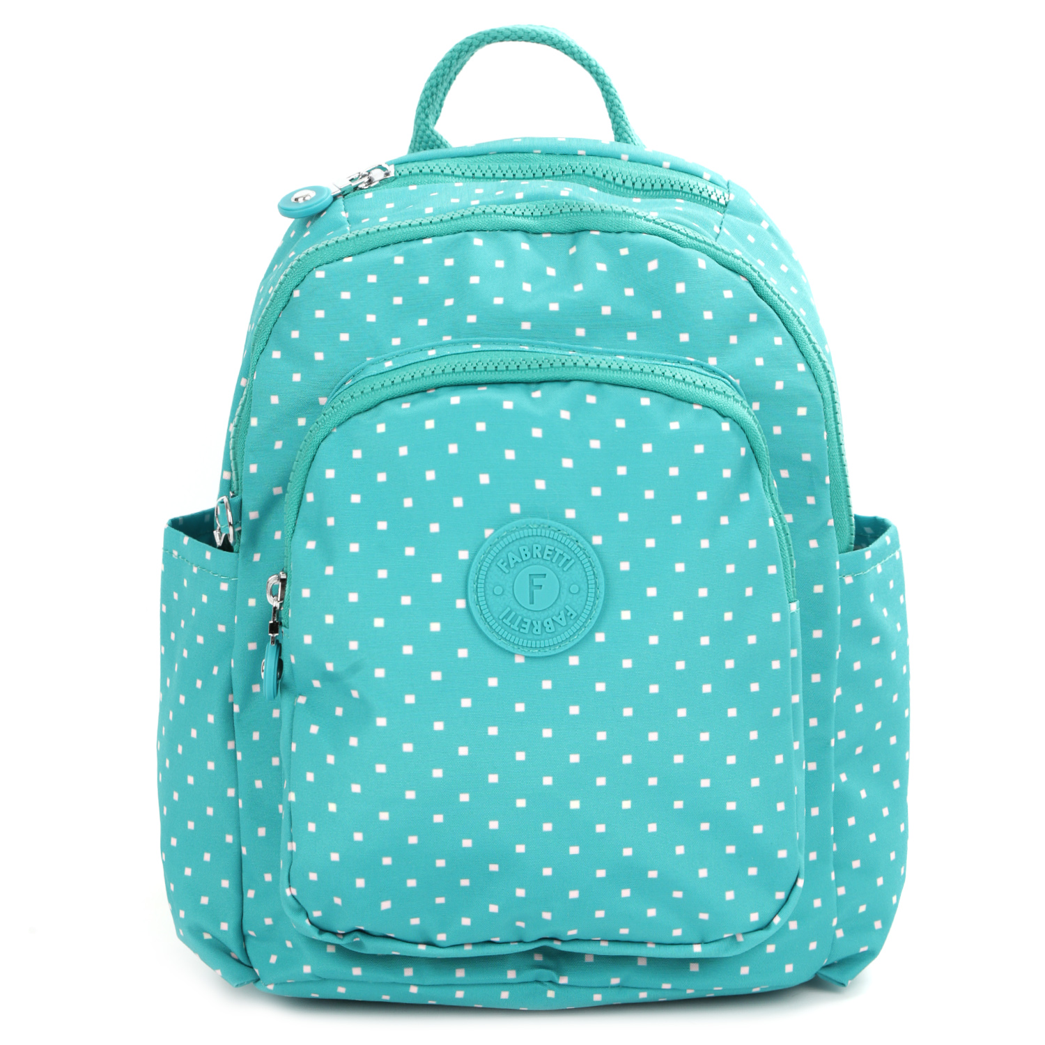 Текстильный рюкзак FABRETTI в зеленом оттенке выполнен из высокотехнологичного влагостойкого полиэстера и декорирован геометрическим принтом. Модель компактного размера имеет продуманную систему хранения. Основное отделение закрывается на полукруглую молнию с удобным поводком. Внутри 1 открытый боковой карман. На лицевой стороне находится вместительный карман на молнии. Сверху и на тыльной стороне предусмотрены карманы быстрого доступа на молнии. По бокам есть 2 открытых кармана. Две текстильные лямки (ширина - 3 см) регулируются по длине. Сверху предусмотрена небольшая ручка, за которую можно носить аксессуар в руке.