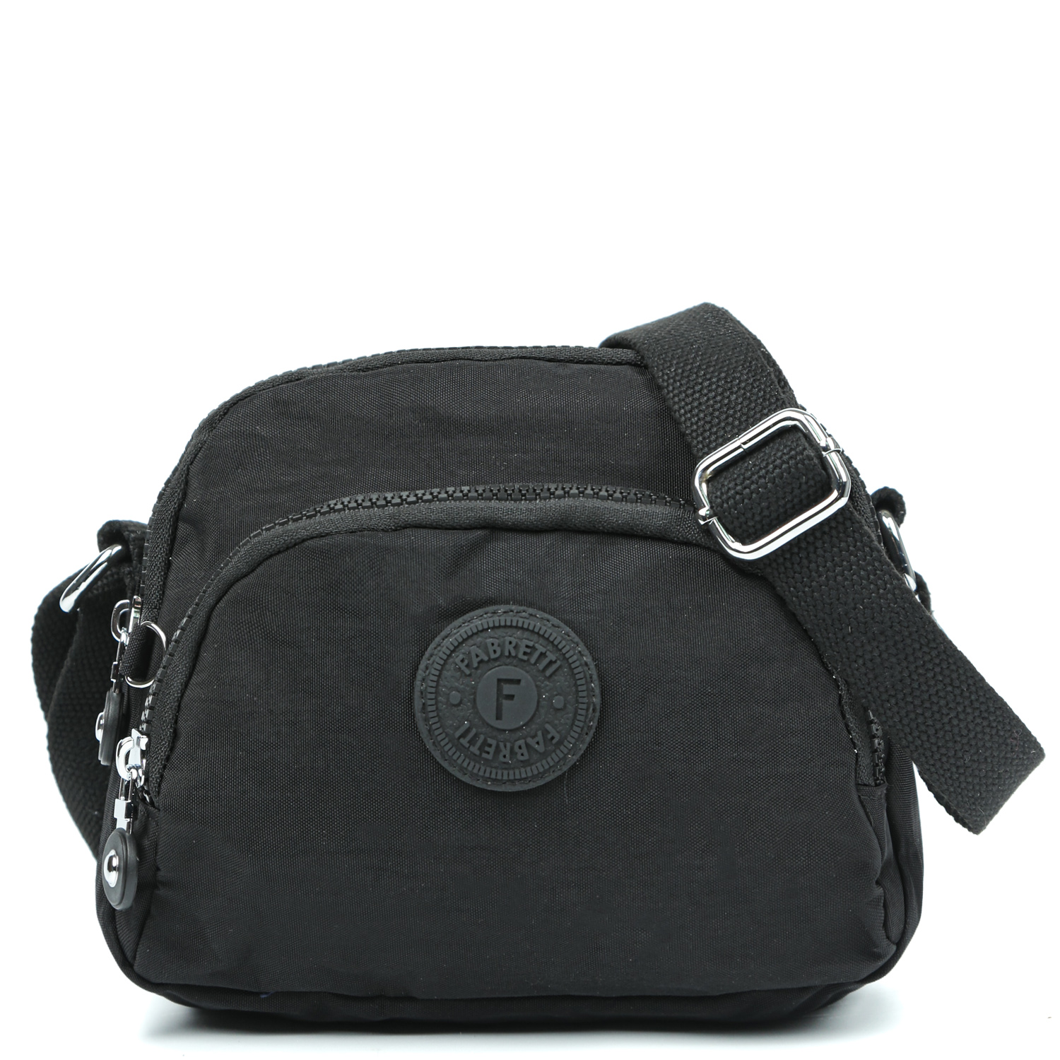 Текстильная сумка FABRETTI в черном цвете выполнена из высокотехнологичного влагостойкого полиэстера легкой жатой фактуры. Он практичен и прост в уходе. Модель отличается компактным размером и продуманной системой хранения. В сумке 2 отделения, каждое из которых закрывается на полукруглую молнию. Внутри есть 2 боковых кармана для мелочей: открытый и на молнии. На лицевой стороне расположен карман на молнии. На тыльной стороне предусмотрен карман быстрого доступа на молнии. Плечевой ремень регулируется по длине, ширина - 2,5 см.