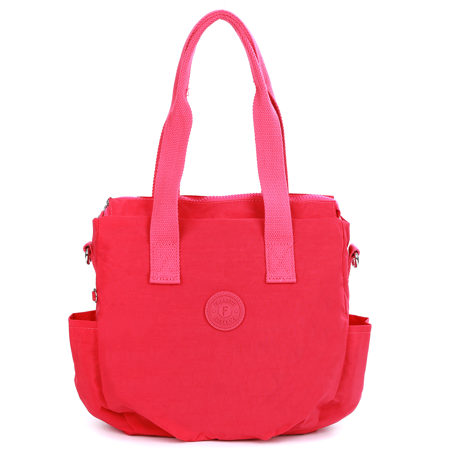 Текстильная сумка на плечо FABRETTI в насыщенном розовом оттенке выполнена из высокотехнологичного влагостойкого полиэстера легкой жатой фактуры. Он практичен и прост в уходе. Основное отделение закрывается на молнию. Внутри есть 3 боковые кармана: 2 открытых и на молнии. На тыльной стороне предусмотрен карман быстрого доступа. По бокам расположены открытые карманы. Удлиненные ручки позволяют комфортно носить сумку на плече или в руке. В комплекте идет съемный текстильный ремень, регулируемый по длине, ширина - 3 см.