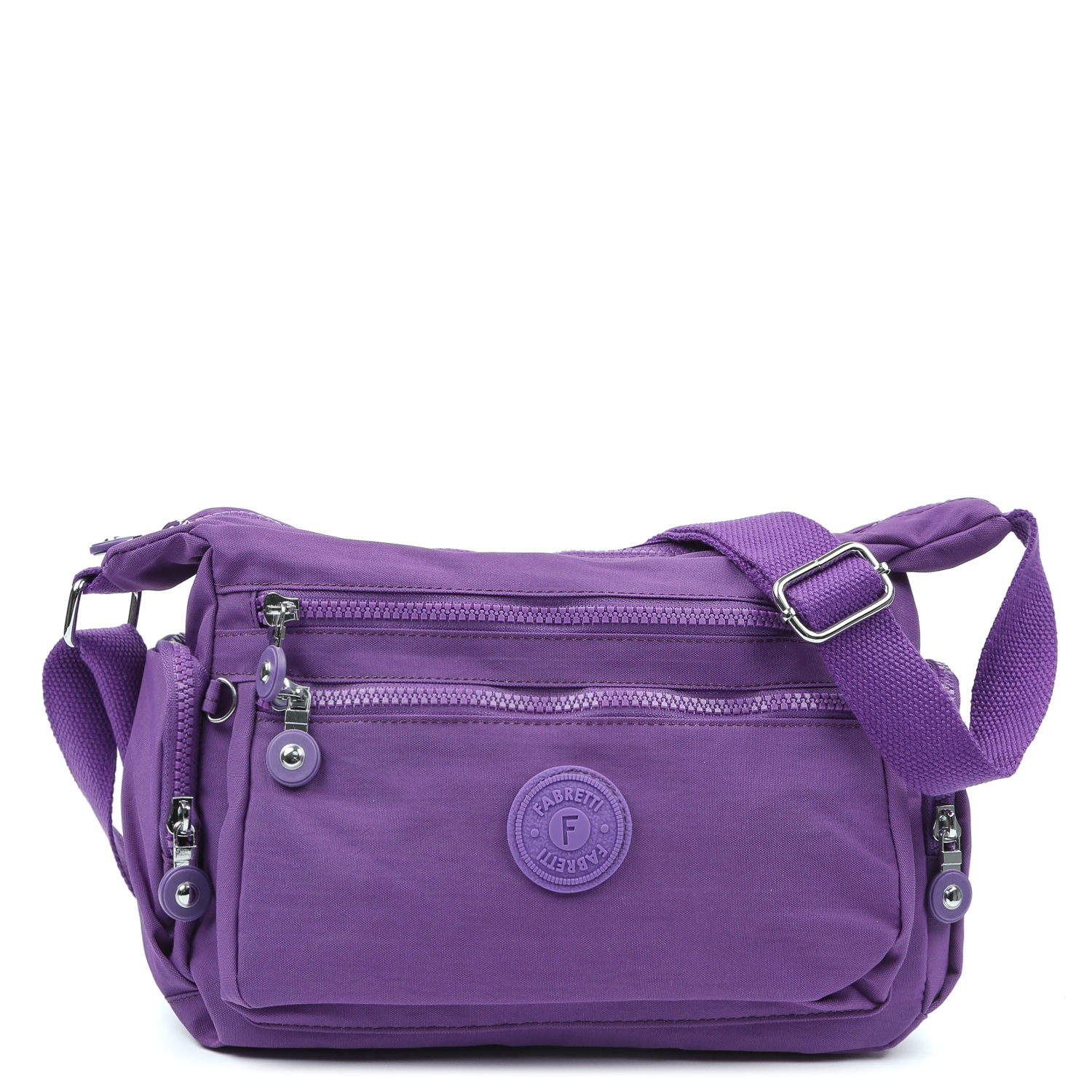 Текстильная сумка FABRETTI в фиолетовом оттенке выполнена из высокотехнологичного влагостойкого полиэстера легкой жатой фактуры. Основное отделение закрывается на молнию. Внутри 3 боковых кармана для мелочей: 2 открытых и на молнии. На лицевой стороне находятся 2 кармана быстрого доступа и ещё один - на тыльной стороне. На боковых сторонах предусмотрены карманы на молнии. Текстильный плечевой ремень регулируется по длине, ширина - 3 см.