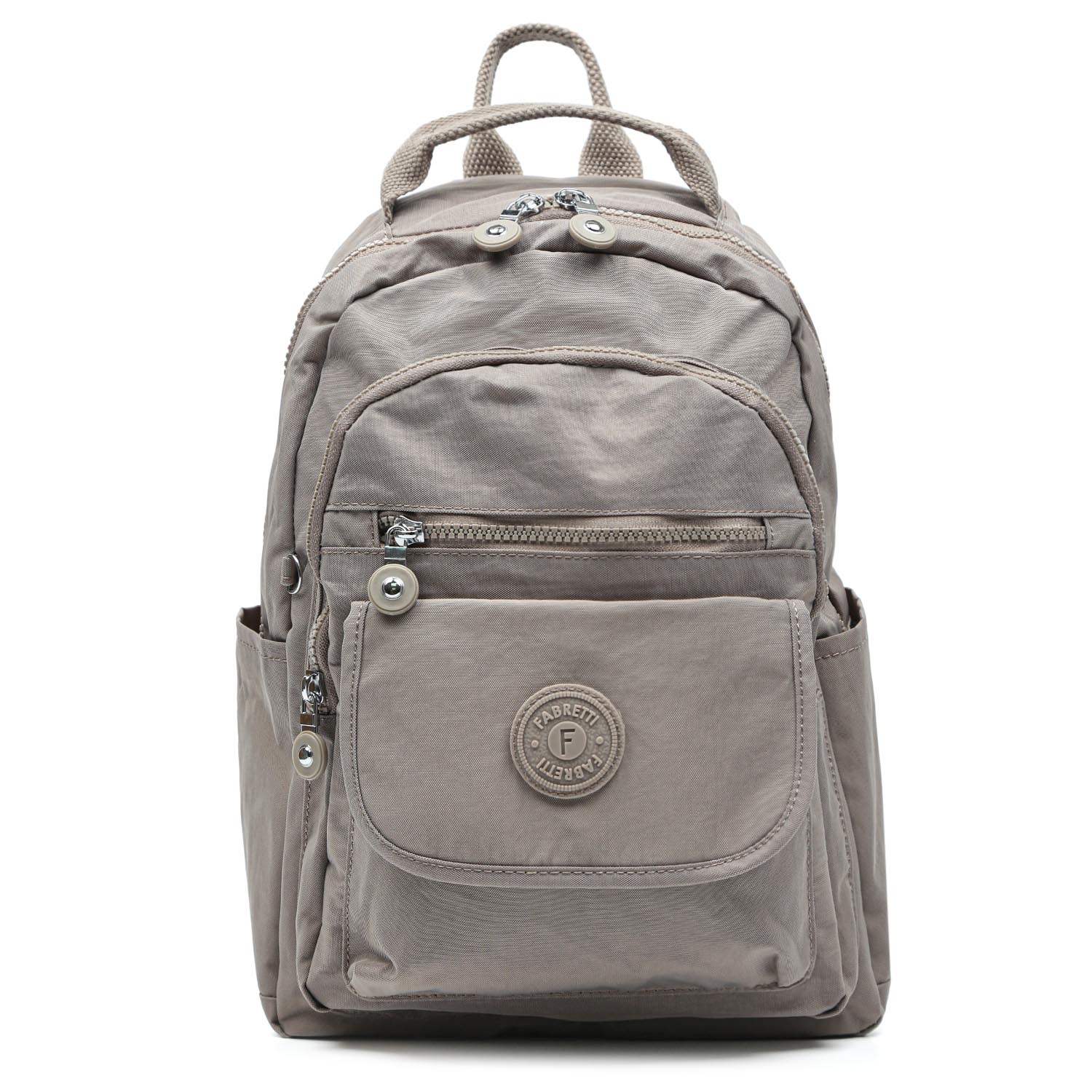 Текстильный рюкзак FABRETTI в бежевом оттенке подойдет тем, кто ведет активный образ жизни, учится и предпочитает путешествовать налегке. Выполнен из высокотехнологичного влагостойкого полиэстера легкой жатой фактуры. Он практичен и прост в уходе. Два отделения закрываются на полукруглую молнию. Внутри основного отделения есть 3 кармана для мелочей: 2 открытых и на молнии, а также секция с мягкой стенкой для гаджетов и шнурок с карабином для ключей. На лицевой стороне расположены 2 кармана: на молнии и с клапаном на магнитной кнопке. По бокам предусмотрены открытые карманы. На тыльной стороне есть карман быстрого доступа на молнии. Мягкие плотные лямки регулируются по длине (ширина - 5,5 см). Сверху есть ручка, чтобы носить в руке.