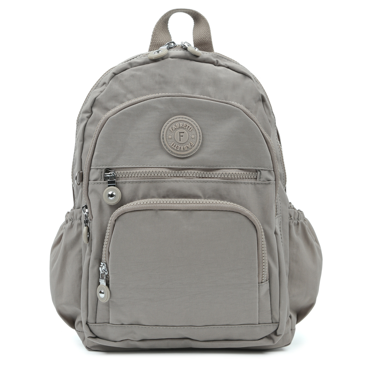 Текстильный рюкзак FABRETTI в бежевом оттенке выполнен из высокотехнологичного влагостойкого полиэстера. Он практичен и прост в уходе. Модель имеет продуманную систему хранения. Основное отделение закрывается на молнию с 2 бегунками. Внутри 3 боковых кармана и секция с мягкой стенкой для гаджетов. На лицевой стороне находятся дополнительное отделение на полукруглой молнии и 2 кармана на молнии. По бокам есть 2 открытых кармана с фиксирующими резинками. На тыльной стороне предусмотрен вертикальный карман быстрого доступа на молнии. Две текстильные лямки регулируются по длине, ширина - 6см. Сверху предусмотрена ручка.