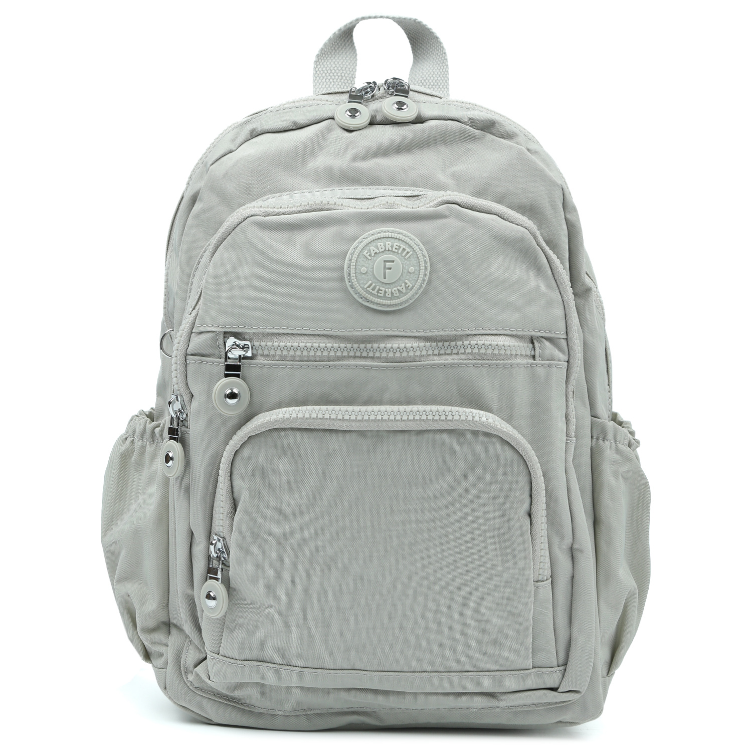 Текстильный рюкзак FABRETTI в светло-сером оттенке выполнен из высокотехнологичного влагостойкого полиэстера. Он практичен и прост в уходе. Модель имеет продуманную систему хранения. Основное отделение закрывается на молнию с 2 бегунками. Внутри 3 боковых кармана и секция с мягкой стенкой для гаджетов. На лицевой стороне находятся дополнительное отделение на полукруглой молнии и 2 кармана на молнии. По бокам есть 2 открытых кармана с фиксирующими резинками. На тыльной стороне предусмотрен вертикальный карман быстрого доступа на молнии. Две текстильные лямки регулируются по длине, ширина - 6см. Сверху предусмотрена ручка.