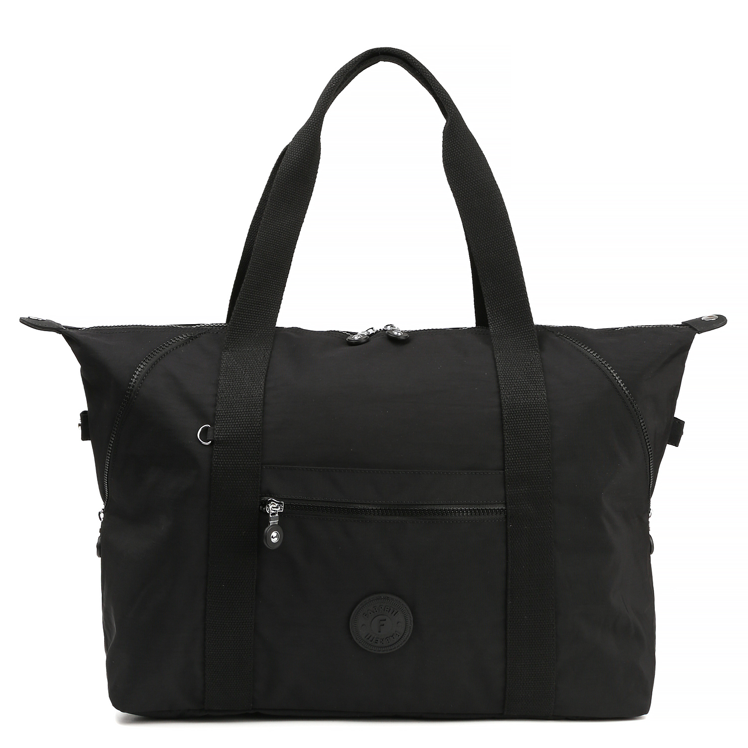 Текстильная сумка FABRETTI в черном цвете выполнена из высокотехнологичного влагостойкого полиэстера. Основное отделение закрывается на молнию. Внутри 3 боковых кармана: 2 открытых и на молнии. Карабин на шнурке поможет быстро найти ключи в сумке. На лицевой стороне находятся 2 кармана: открытый и на молнии. На тыльной стороне расположен рукав для крепления на ручку чемодана. Текстильный плечевой ремень регулируется по длине, ширина - 4 см.