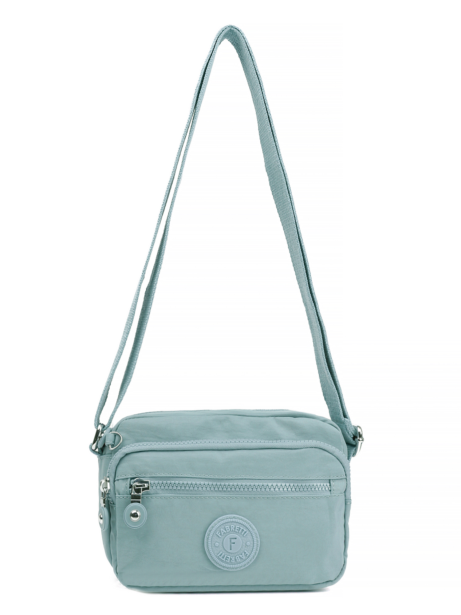 Текстильная сумка итальянского бренда FABRETTI серо-голубого оттенка выполнена из высокотехнологичного влагостойкого полиэстера легкой жатой фактуры. Он практичен и прост в уходе. Модель отличается компактным размером и продуманной системой хранения. В сумке три отделения, каждое из которых закрывается на полукруглую молнию с удобным поводком. Внутри центрального отделения три боковых кармана для мелочей: два открытых и на молнии. Карабин на шнурке поможет быстро найти ключи в сумке. На лицевой стороне расположен карман быстрого доступа на молнии. На тыльной стороне также предусмотрен карман быстрого доступа на молнии. Текстильный плечевой ремень регулируется по длине, ширина - 3 см.