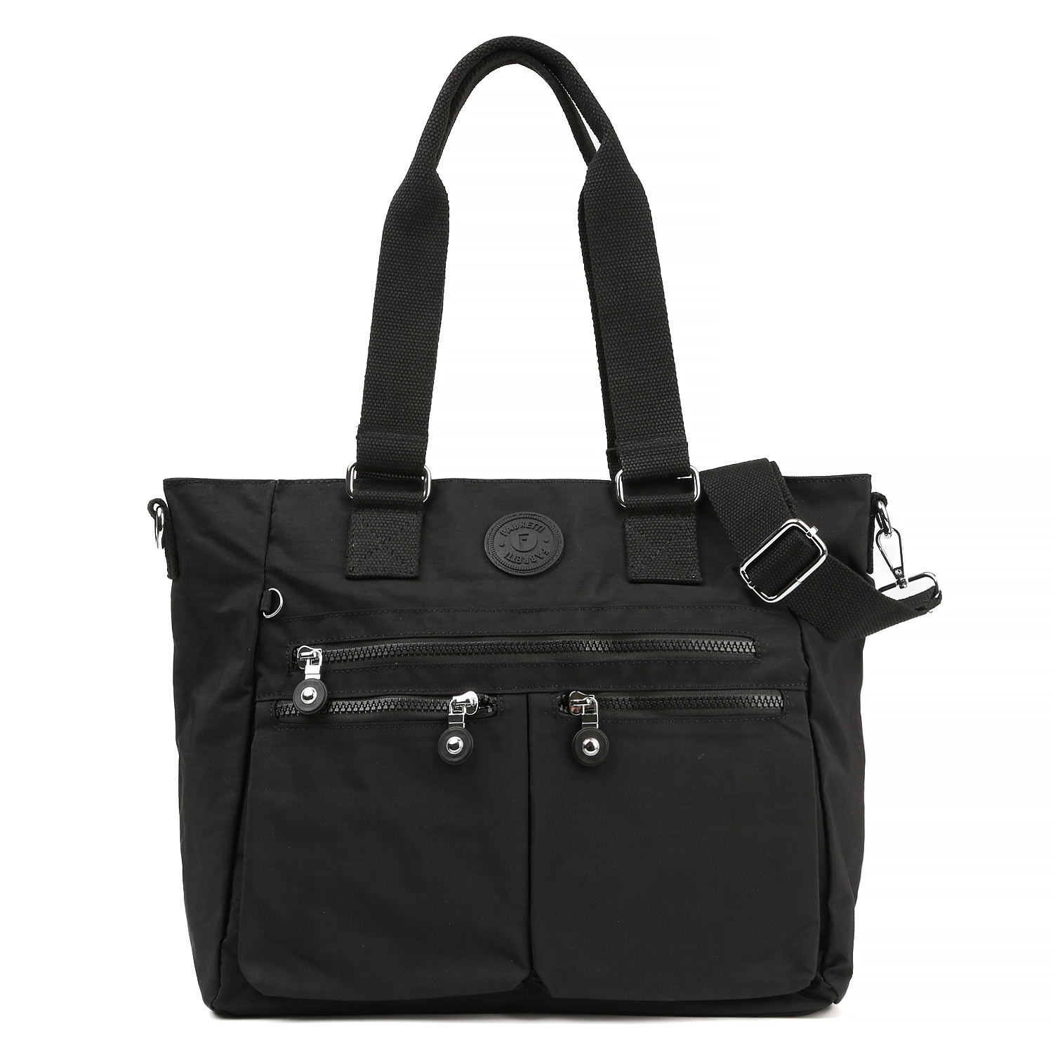 Текстильная сумка FABRETTI в черном цвете выполнена из высокотехнологичного влагостойкого полиэстера. Основное отделение закрывается на молнию. Внутри 3 боковых кармана: 2 открытых и на молнии. Карабин на шнурке поможет быстро найти ключи в сумке. На лицевой стороне находится карман на молнии, два кармана для мелочей на молнии. На тыльной стороне есть карман быстрого доступа на молнии. Удобные ручки позволяют комфортно носить аксессуар в руке. Текстильный плечевой ремень регулируется по длине, ширина - 4 см.