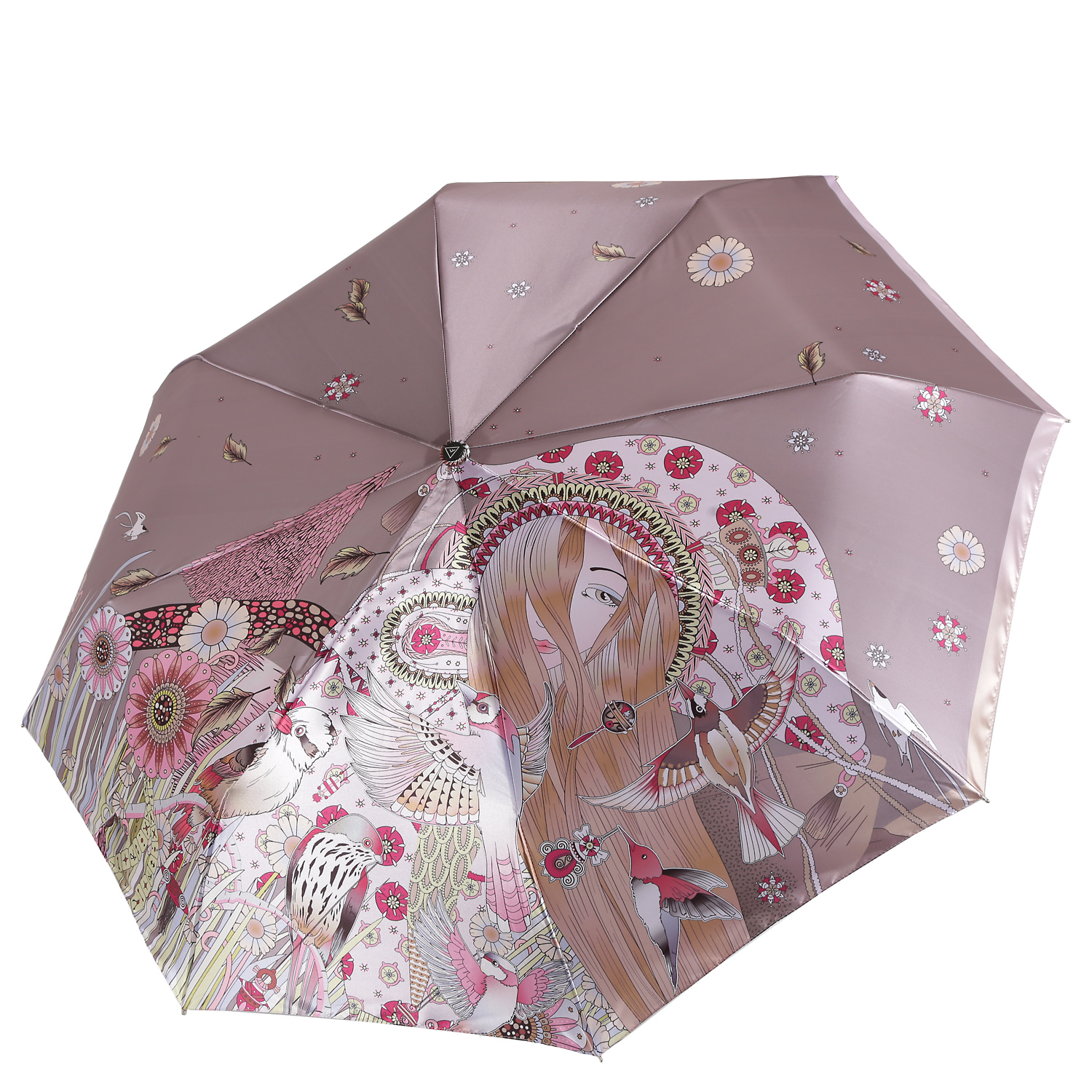 Зонт-автомат итальянского бренда Fabretti украшен дизайнерским принтом с этническими мотивами и богат художественными элементами: птицами, цветами, переплетающимися орнаментами, объединенными на фоне цвета тауп вокруг портрета девушки с длинными темно-русыми волосами. Такой четкий рисунок и тонкую цветопередачу удалось получить с помощью техники цифровой печати. Купол модели выполнен из полиэстера (сатин) и обладает изысканной шелковистой текстурой и блеском. Конструкция зонта изготовлена из прочной стали, эргономичная ручка - из пластика. Модель снабжена системой "антиветер".