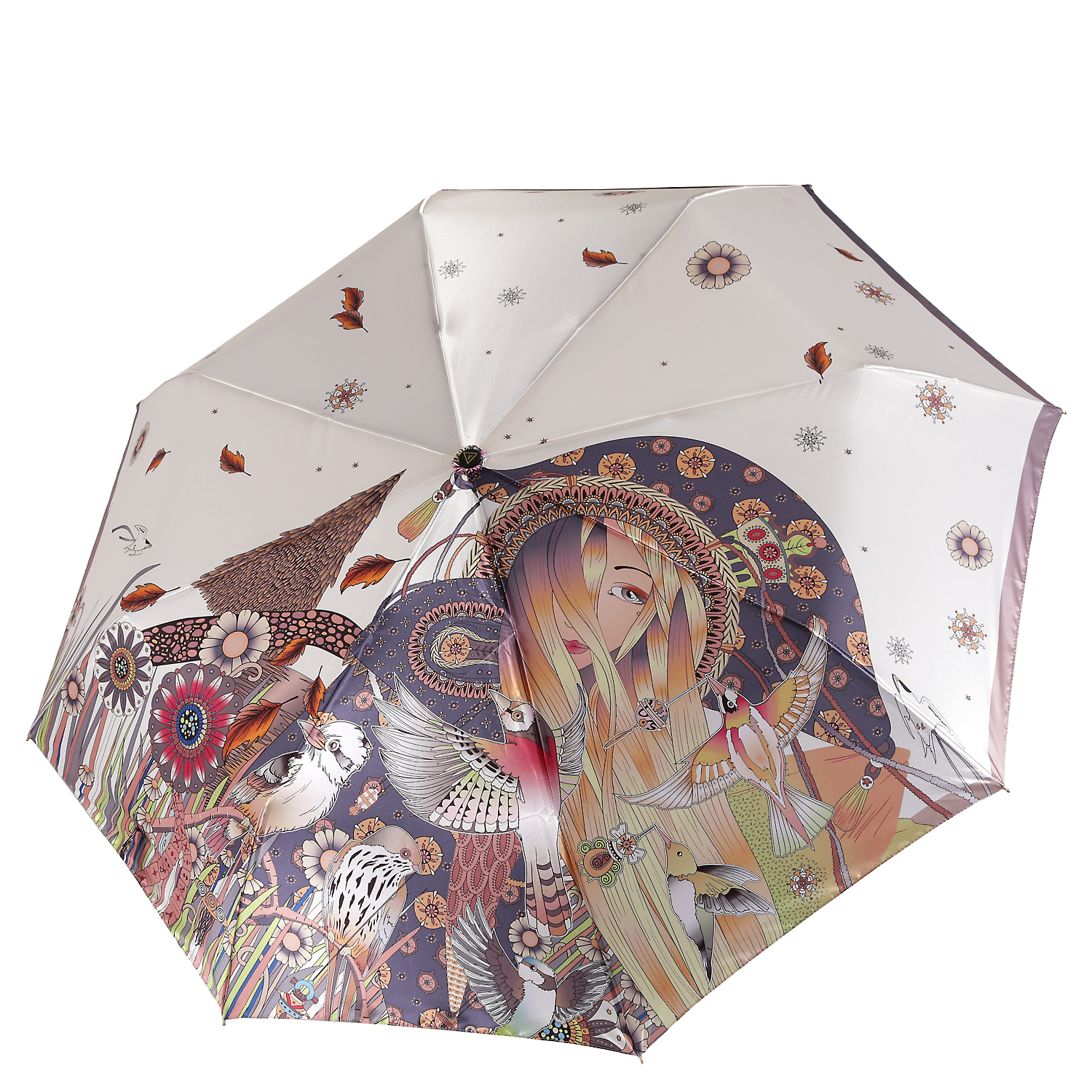Зонт-автомат итальянского бренда Fabretti украшен дизайнерским принтом с этническими мотивами и богат художественными элементами: птицами, цветами, переплетающимися орнаментами, объединенными вокруг портрета девушки с длинными каштановыми волосами. Такой четкий рисунок и тонкую цветопередачу удалось получить с помощью техники цифровой печати. Купол модели выполнен из полиэстера (сатин) и обладает изысканной шелковистой текстурой. Конструкция зонта изготовлена из прочной стали, эргономичная ручка - из пластика. Модель снабжена системой "антиветер".